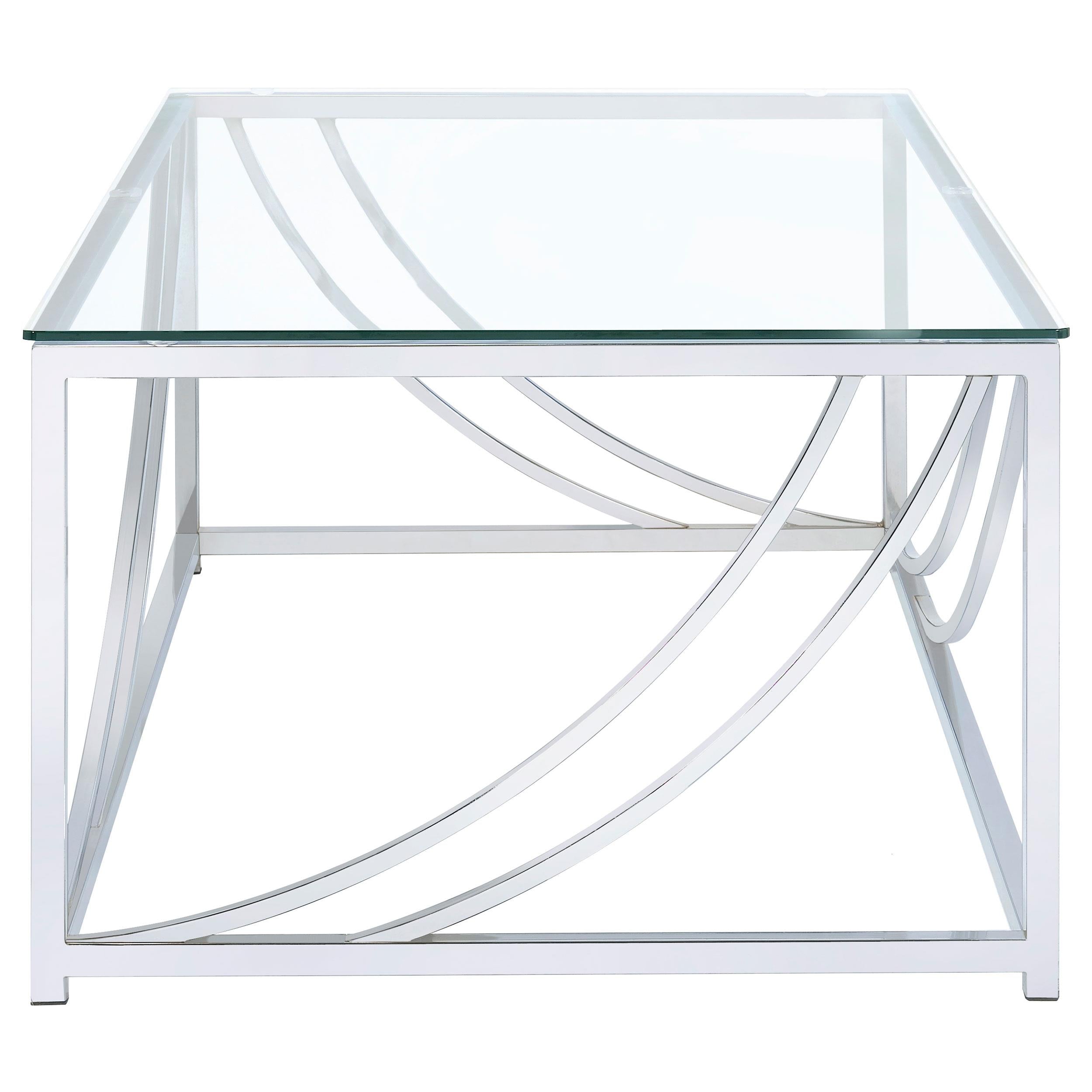 This rectangular coffee table boasts a modern design with a clear tempered glass top that highlights its sleek aesthetic. The sturdy metal frame, finished in electroplated polished chrome, features gracefully curved accents for an elegant touch. Its minimalist structure pairs style with durability, ensuring long-lasting use. Perfect for living rooms, this table combines functionality with a refined contemporary appeal.