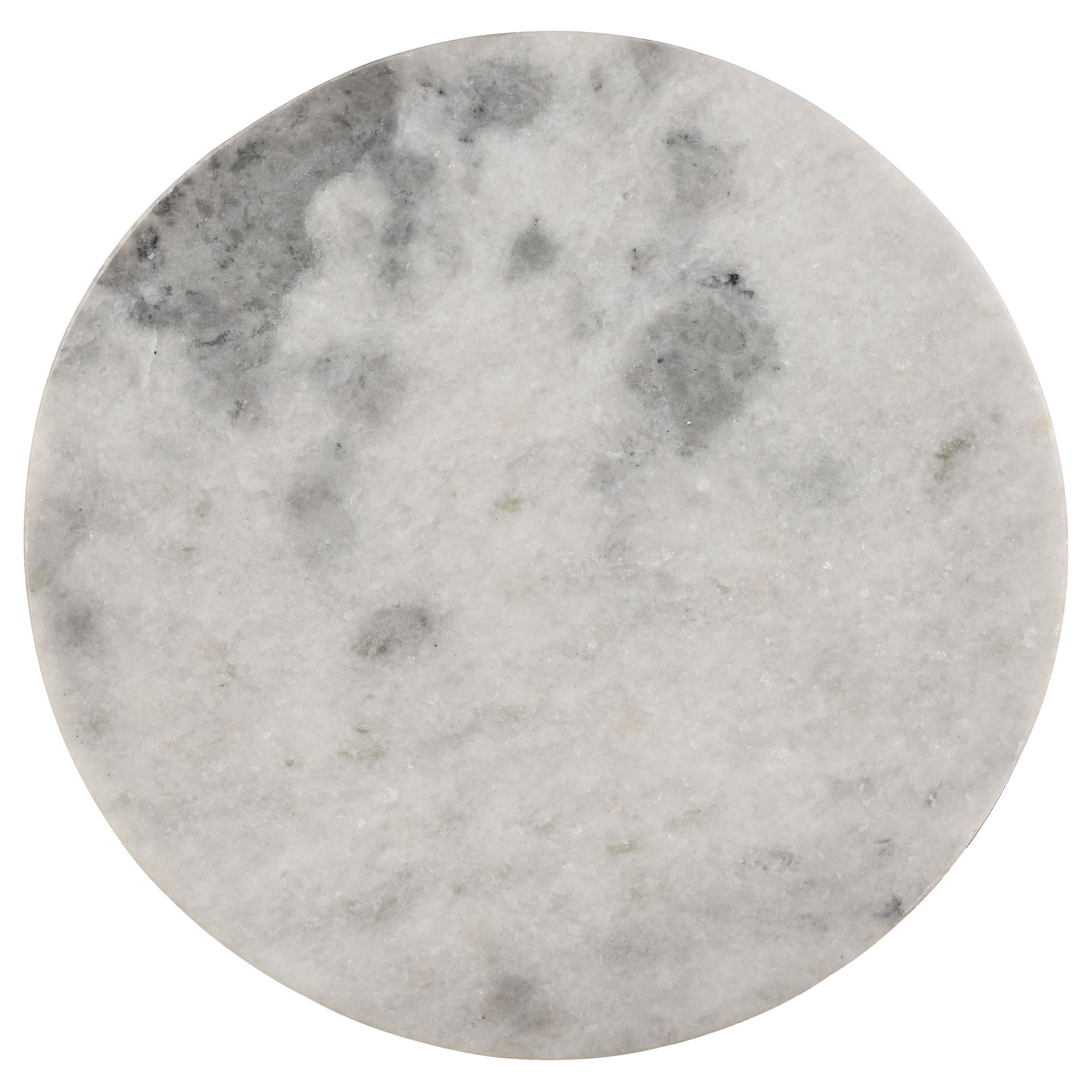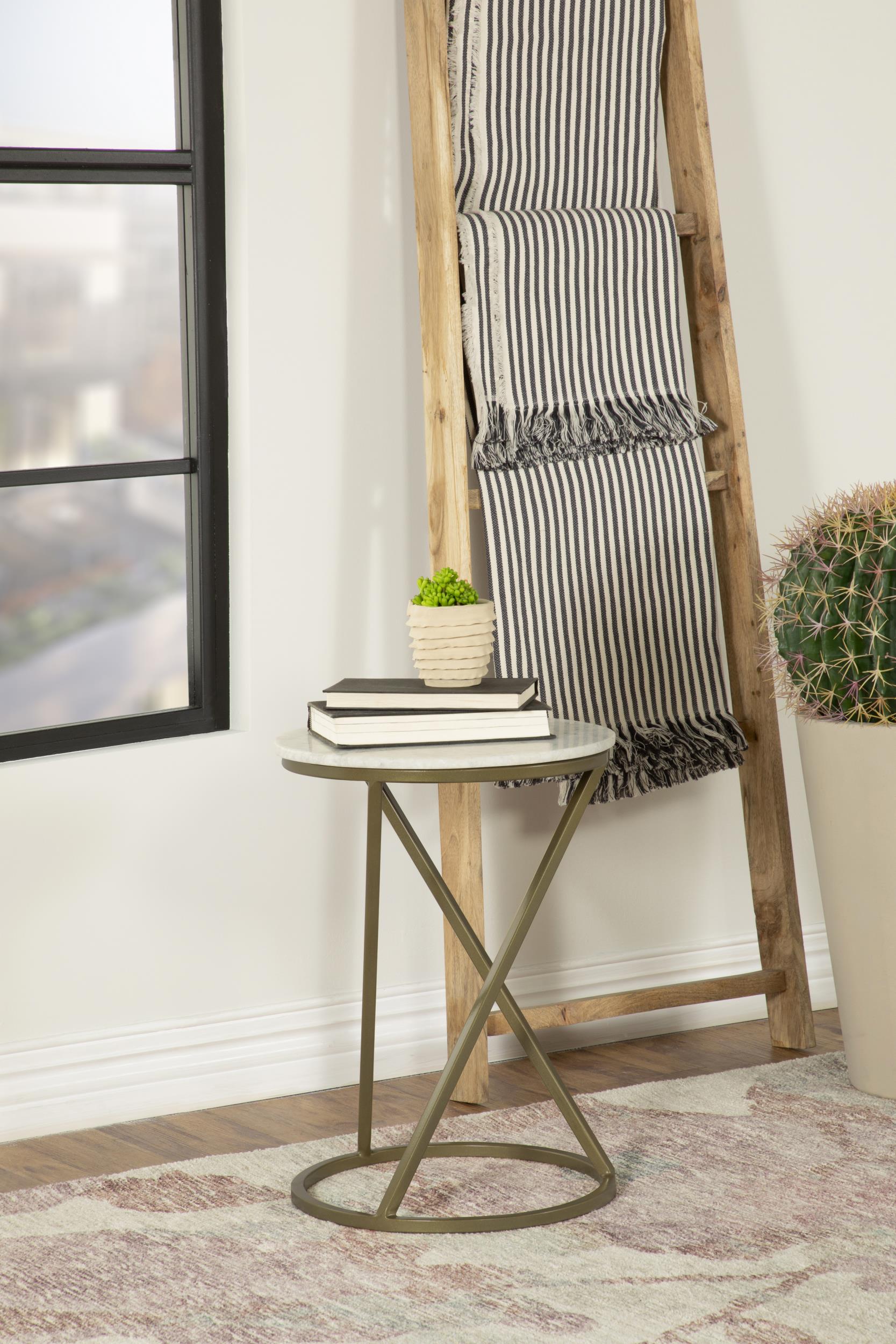 A seamless blend of classic elegance and modern design, this round accent table features a solid white marble top, bringing a timeless and sophisticated touch to any space. The sculptural metal base, finished in a warm antique gold, showcases a graceful geometric design, adding an airy yet structured appeal. Its compact and versatile form makes it perfect as a side table, nightstand, or decorative display for books, plants, or refreshments. Whether placed beside a lounge chair, sofa, or bed, this table enhances any contemporary, glam, or transitional interior with understated luxury.