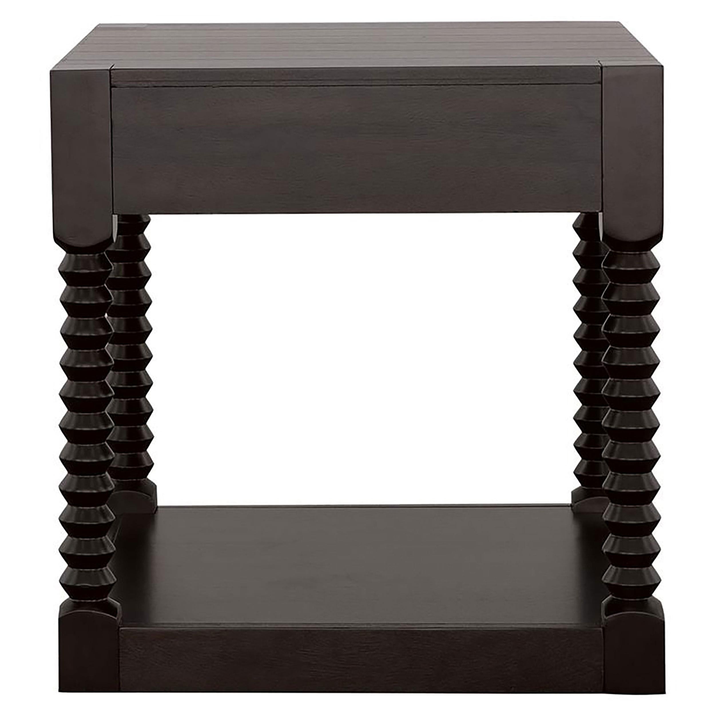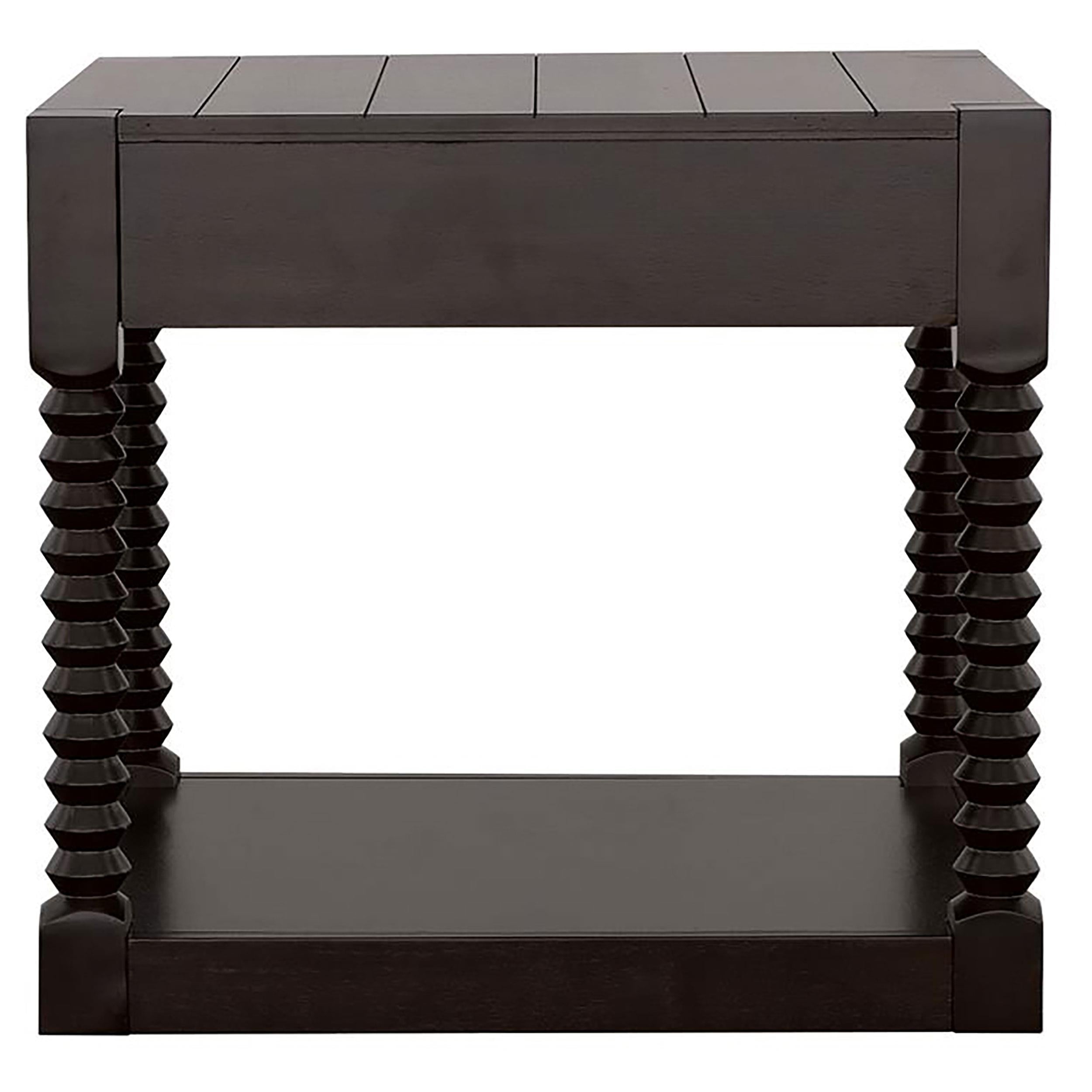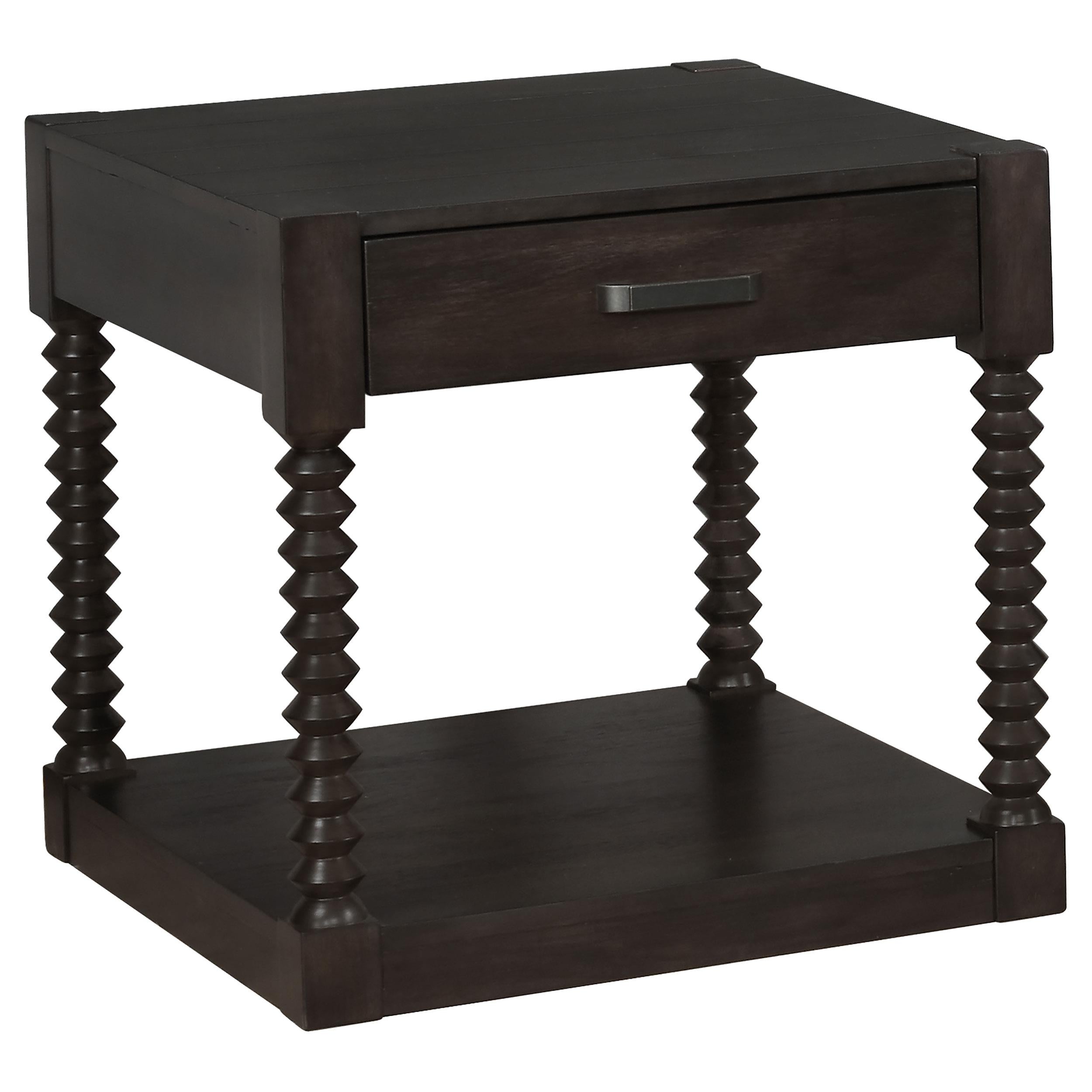 This transitional end table is the perfect addition to a modern farmhouse living room. With a coffee bean brown finish throughout, it lends itself to a variety of rustic color palettes. Adding a visual statement are spindle style legs and a plank style tabletop surface, spacious enough for table lamps and decor. Keep remotes and reading material nearby in a single top drawer, adorned with a long drawer handle in a gunmetal finish. In addition, this transitional end table offers ample space beneath with a bottom shelf for showcasing decor or keeping a basket of throws.