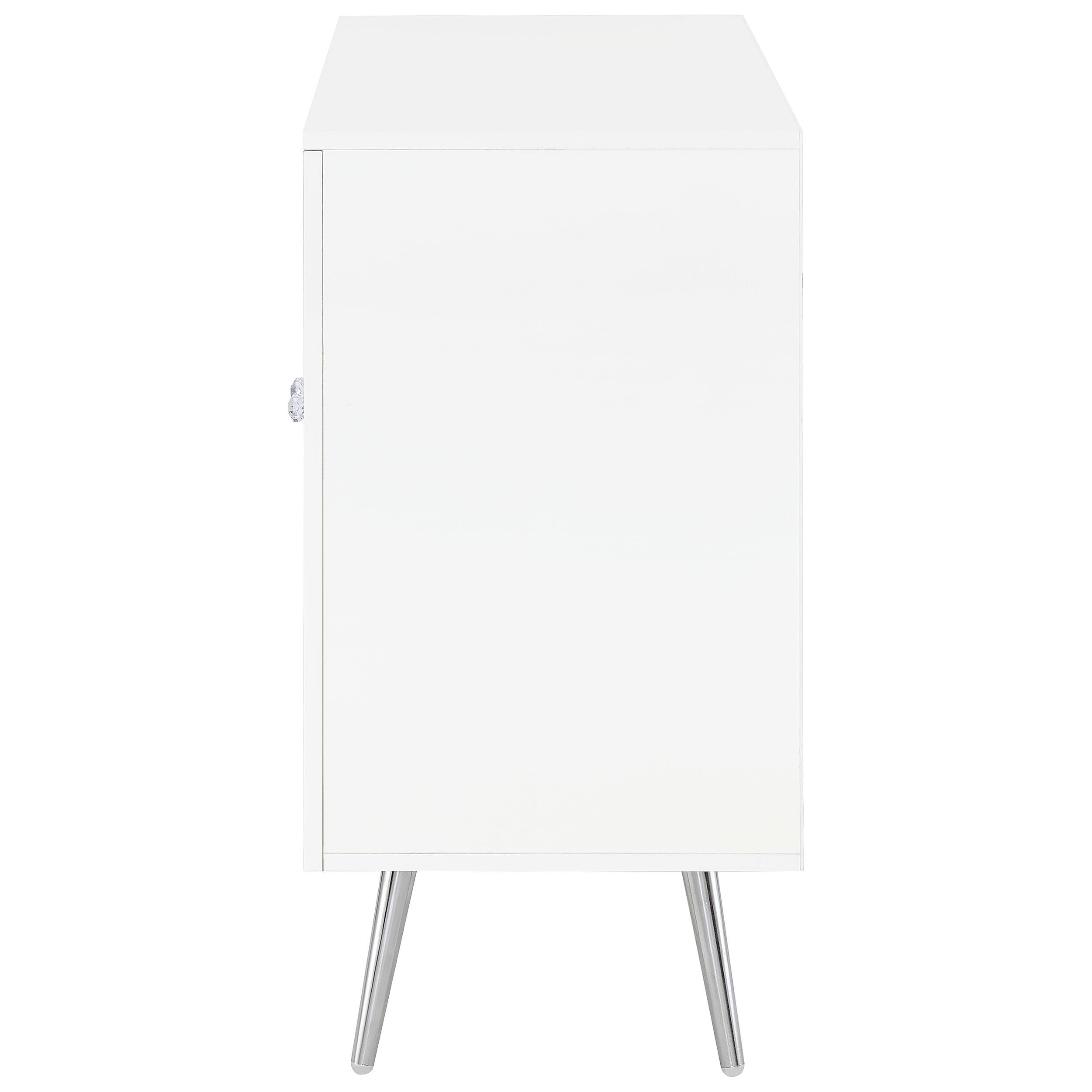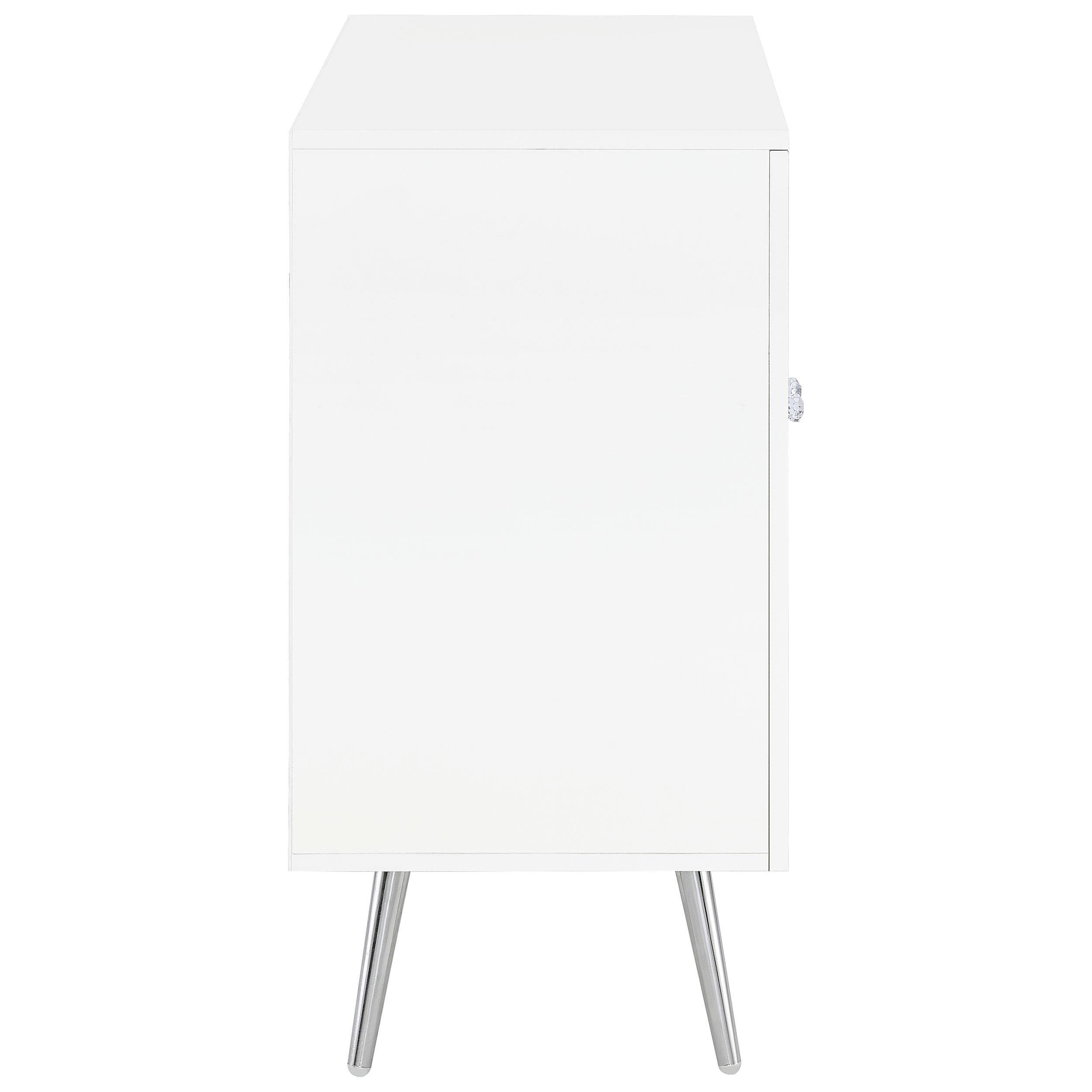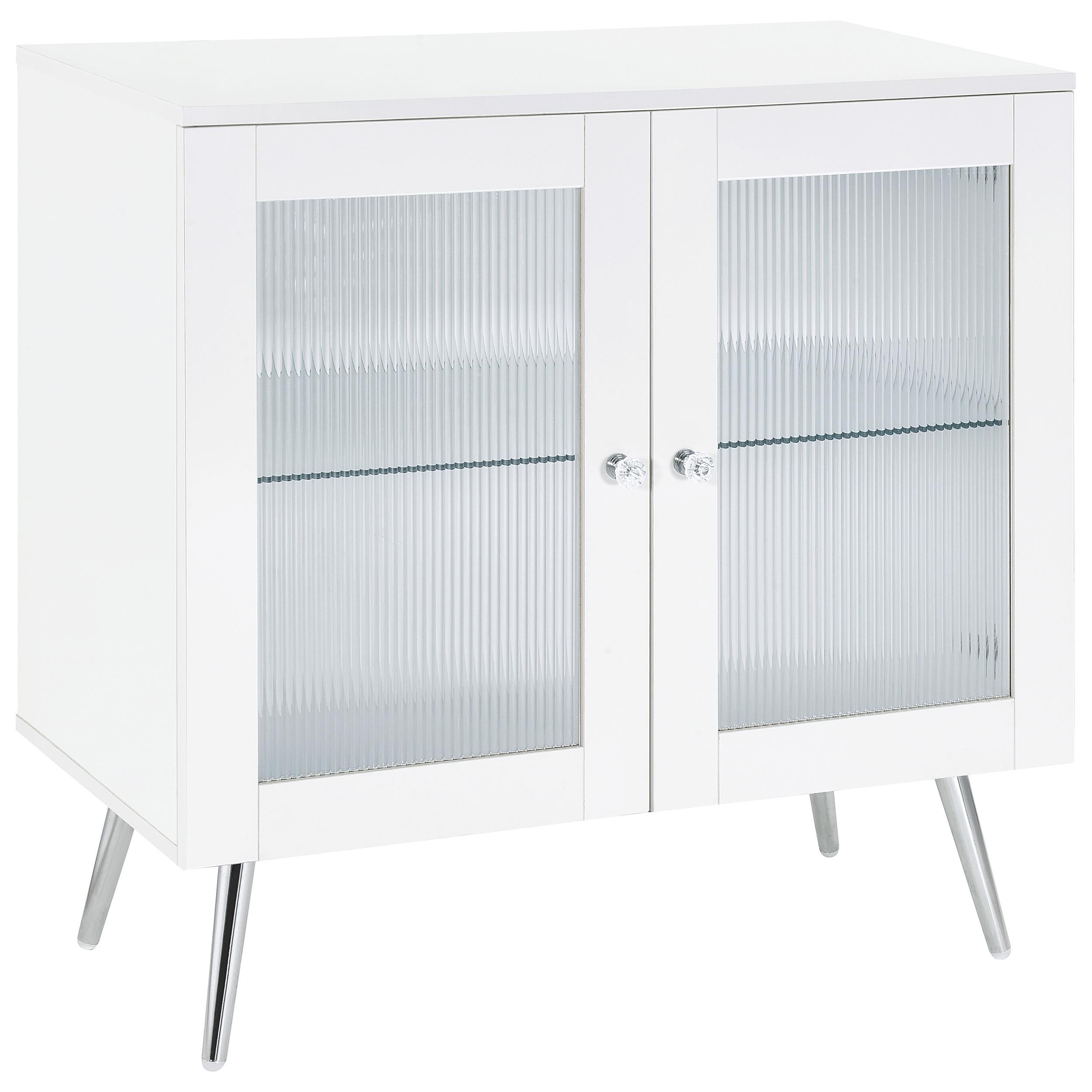 Step into a world where classic charm meets modern elegance with this 2-door accent cabinet. The crisp white finish on engineered wood construction is beautifully complemented by the textural contrast of rippled doors. Tapered steel legs, electroplated in chrome, give rise to two tiers of shelving, including a tempered glass shelf, all crowned with chic acrylic crystal knobs. This piece is not just a storage solution, but a statement that adds a touch of sophistication to any space.