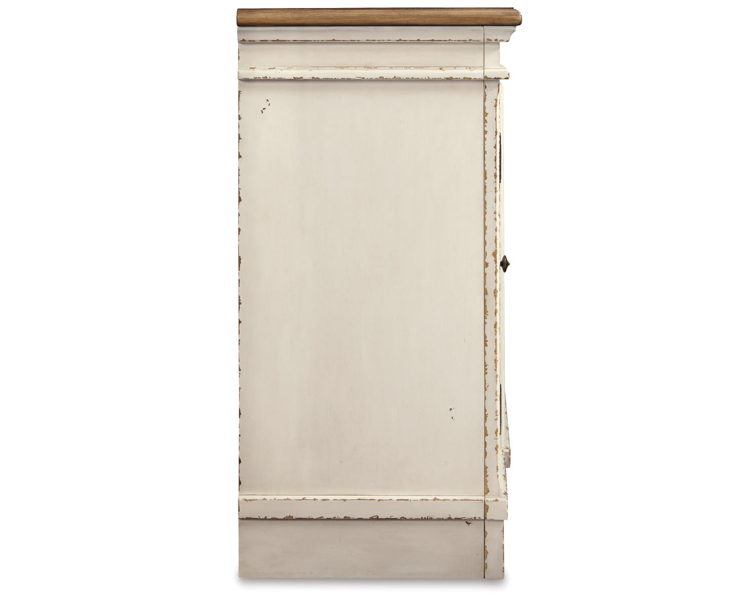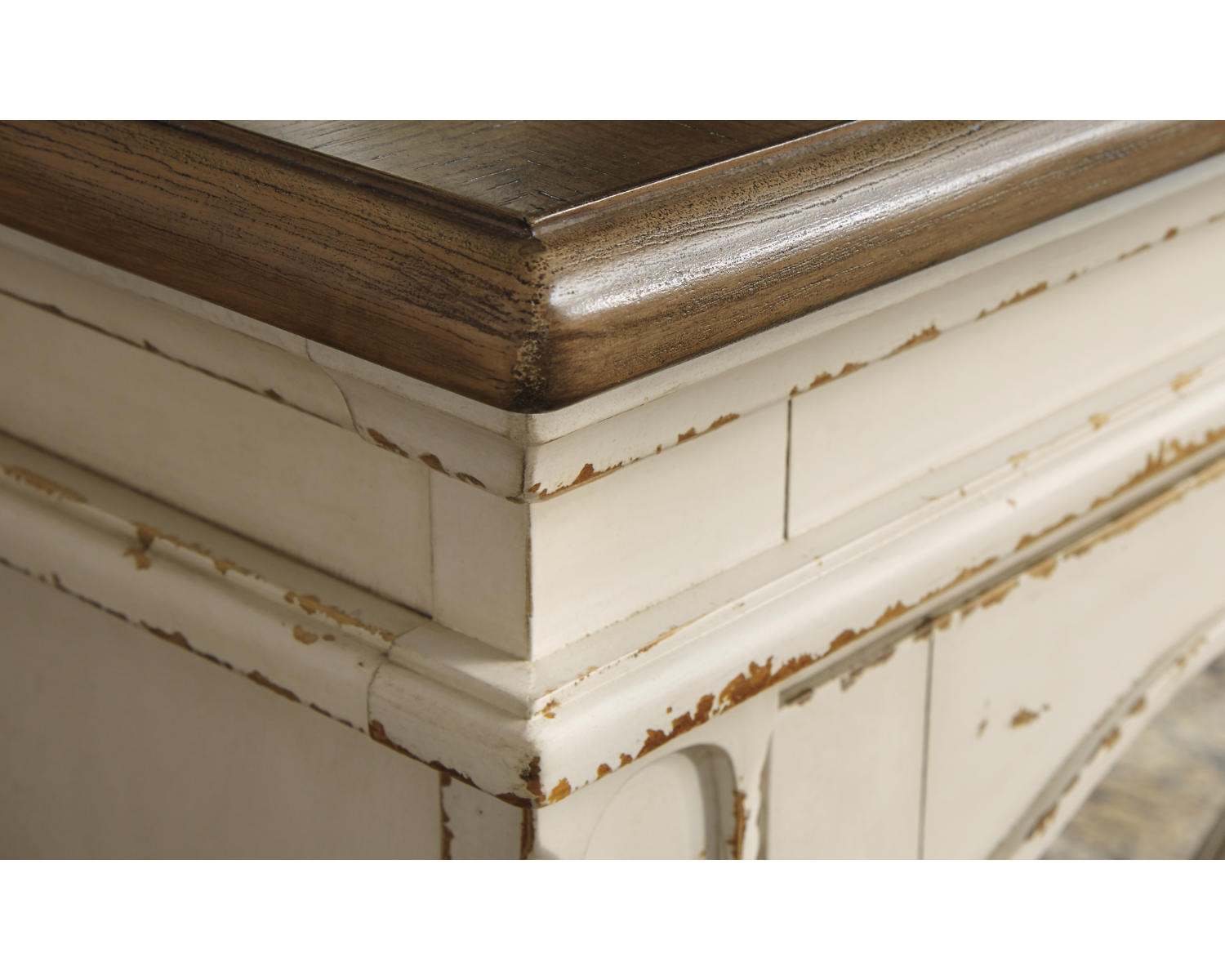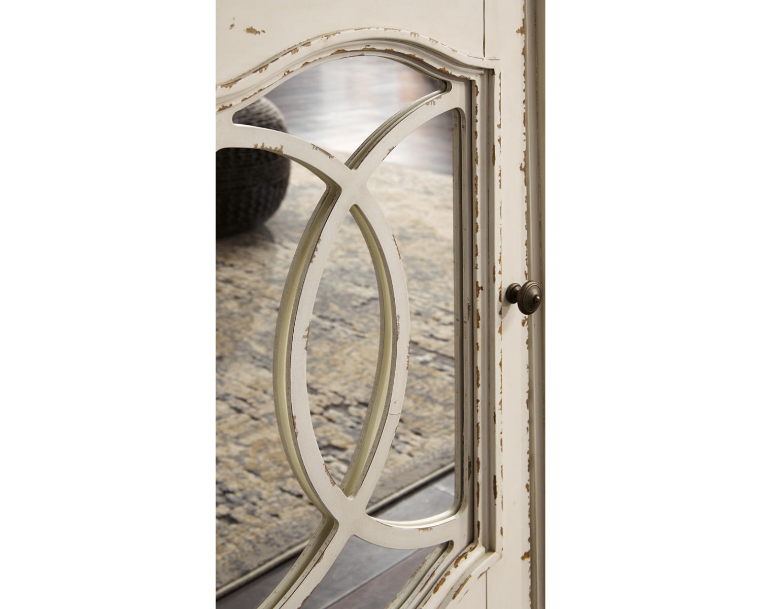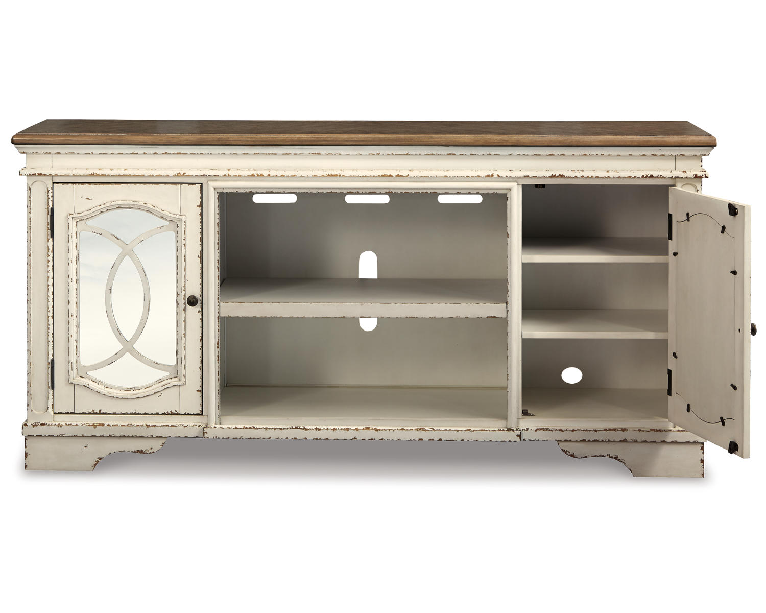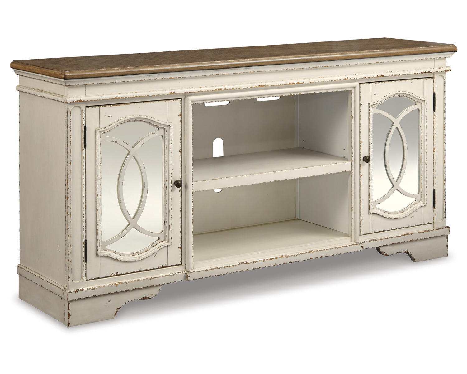 Elevating the art of traditional cottage styling, this TV stand with fireplace option is beautifully in tune with your taste. Antiqued two-tone aesthetic blends a chipped white with a distressed wood tone top for added charm. Cabinet doors’ decorative fretwork over mirrored glass adds a lovely twist. Compatible with W100-121 fireplace insert (sold separately).