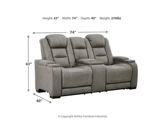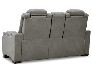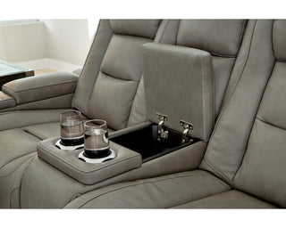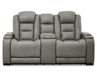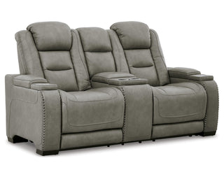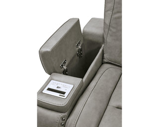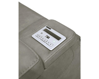 Reserved for him and made for her, this power reclining loveseat in gray delivers all the comfort and style you could ask for. Inspired by sports car interiors, the expertly matched leather and faux leather upholstery has a “perforated automotive” treatment for that much more appeal. Positioned at your fingertips, the advanced one-touch power control puts you in the driver’s seat with everything from an Easy View™ power headrest and power lumbar support, to a USB port and wireless charging for your phone. Talk about fully loaded. And with integrated cup holders and hidden storage compartments under the posh, padded armrests, this designer power reclining loveseat makes the most of every inch of space.