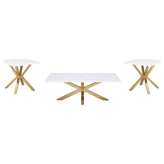 Upgrade your living room with this modern coffee table set, featuring a rectangular coffee table and a square end table. Each piece boasts a white faux marble top with realistic veining for timeless elegance. The star-shaped bases, crafted from durable stainless steel, are coated in a radiant gold finish using Particle Vapor Deposition (PVD), offering a blend of sculptural design and lasting durability. This set is the perfect combination of contemporary style and practical functionality for any modern space.
