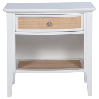 Update your bedside with the approachable, tailored style of this modern coastal nightstand. Complete with one drawer and one shelf, it provides an easy mix of storage and display, creating a place for all your evening essentials. The nightstand boasts a fresh white finish paired with natural rattan accents on the drawer front and shelf. The drawer is complete with felt lining, in stylish black, offering the perfect touch of luxury and protection for delicate items. Add a few favorite books to the shelf to create a personal touch at your bedside.