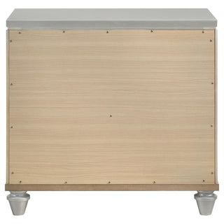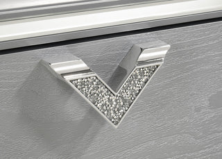 Shimmering details create the glamorous vibe of this modern two-drawer nightstand. While two drawers create ample bedside storage, the nightstand creates a chic accent beside your bed. It showcases a light silver finish with wood grain accents on its drawer fronts and shiny trim that adds dimensionality. Each drawer is accented with a V-shaped, glittering pull that adds jeweled flair and sophistication. Its top drawer features felt lining, adding protection for valuables and electronics.