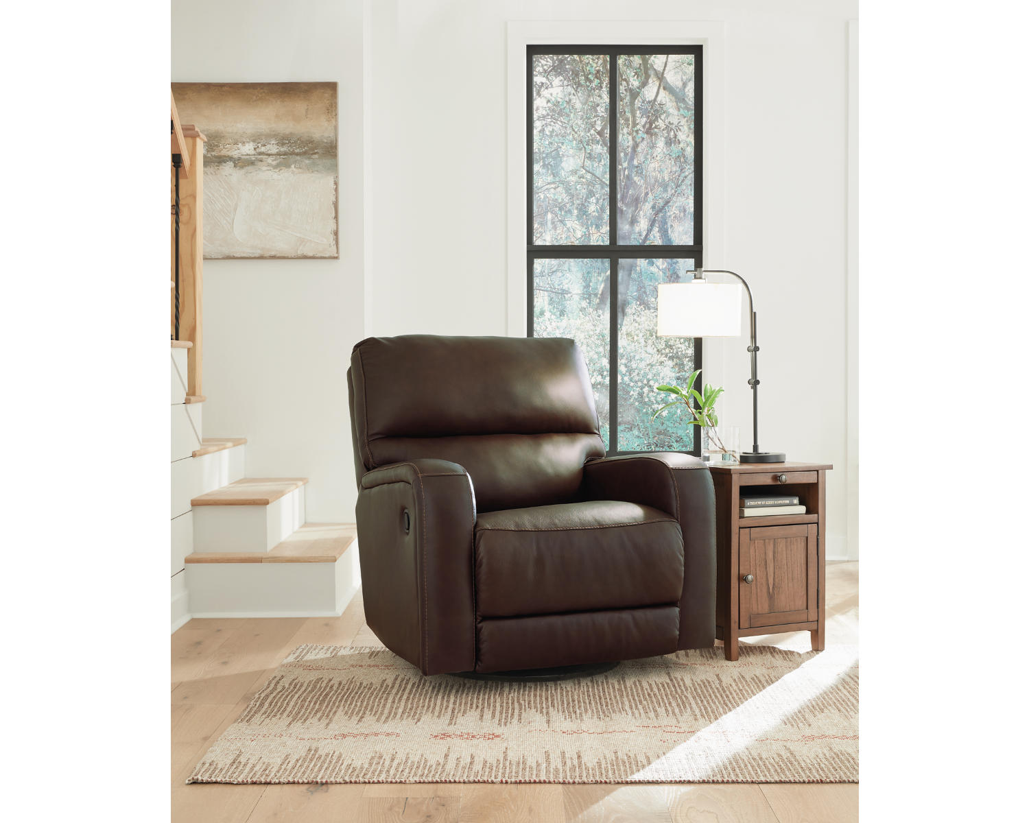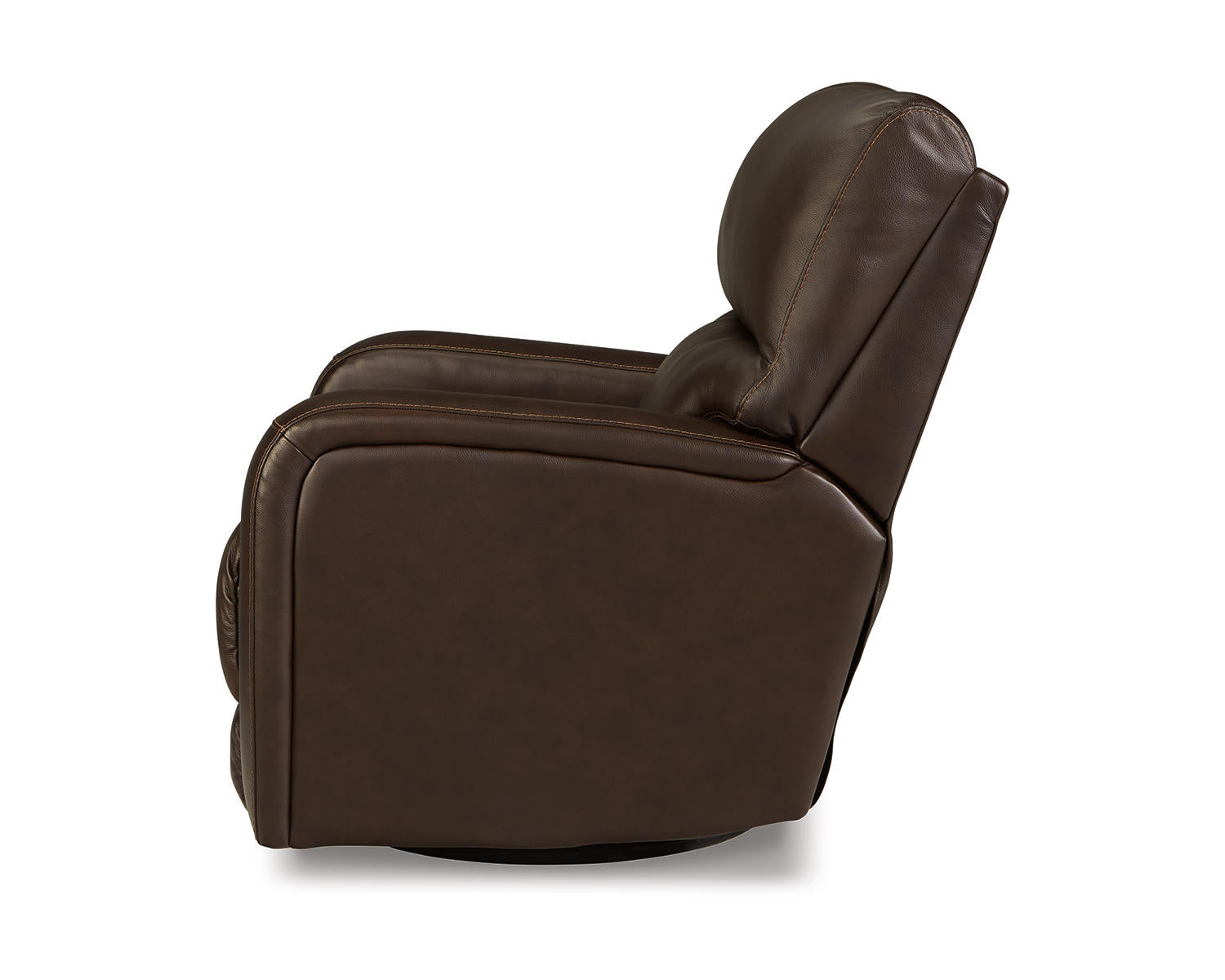 Embrace streamlined design. The sleek form of this swivel glider recliner is rich in tailored function. Its reclining, swivel and gentle rocking motions relax you in refined style. And the expertly matched leather and faux leather upholstery, in a deep neutral, levels up the recliner's affordable luxury.