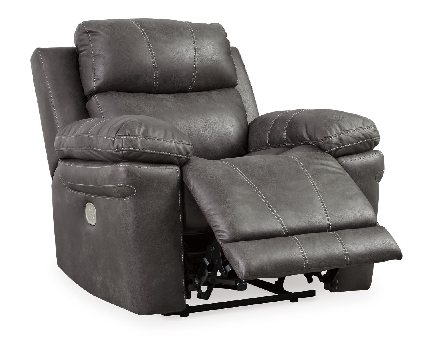 Coming in hot! Discover this power recliner. Top-of-the-line faux leather fabric gives you the upscale look you want for less. Not to mention it feels incredible. Take a seat and raise your legs with one easy push of a button. The extended ottoman provides extra length for relaxing your legs. Want to watch TV or read in comfort? Easily fix your view with the power adjustable headrest. Complete with dramatic, jumbo stitching, this piece is out to capture your heart with style and comfort.