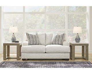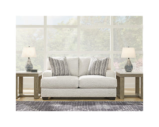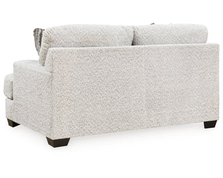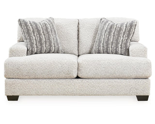 This loveseat speaks to those drawn to fresh, contemporary style with richly neutral appeal. Wrapped in a wonderfully plush fabric loaded with multi-tonal interest, this on-trend piece has a warm, welcoming charm. Coordinating accent pillows add to the indulgence. Kick back, relax and settle in for comfort with this cool addition for modern spaces.