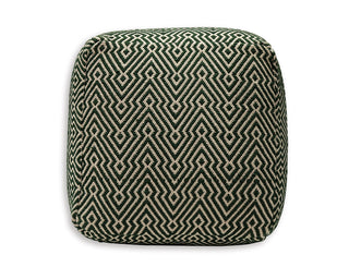 Hand woven geometric design in green and ivory. Cotton cover with polystyrene bead filling. Zipper closure. Spot clean only.