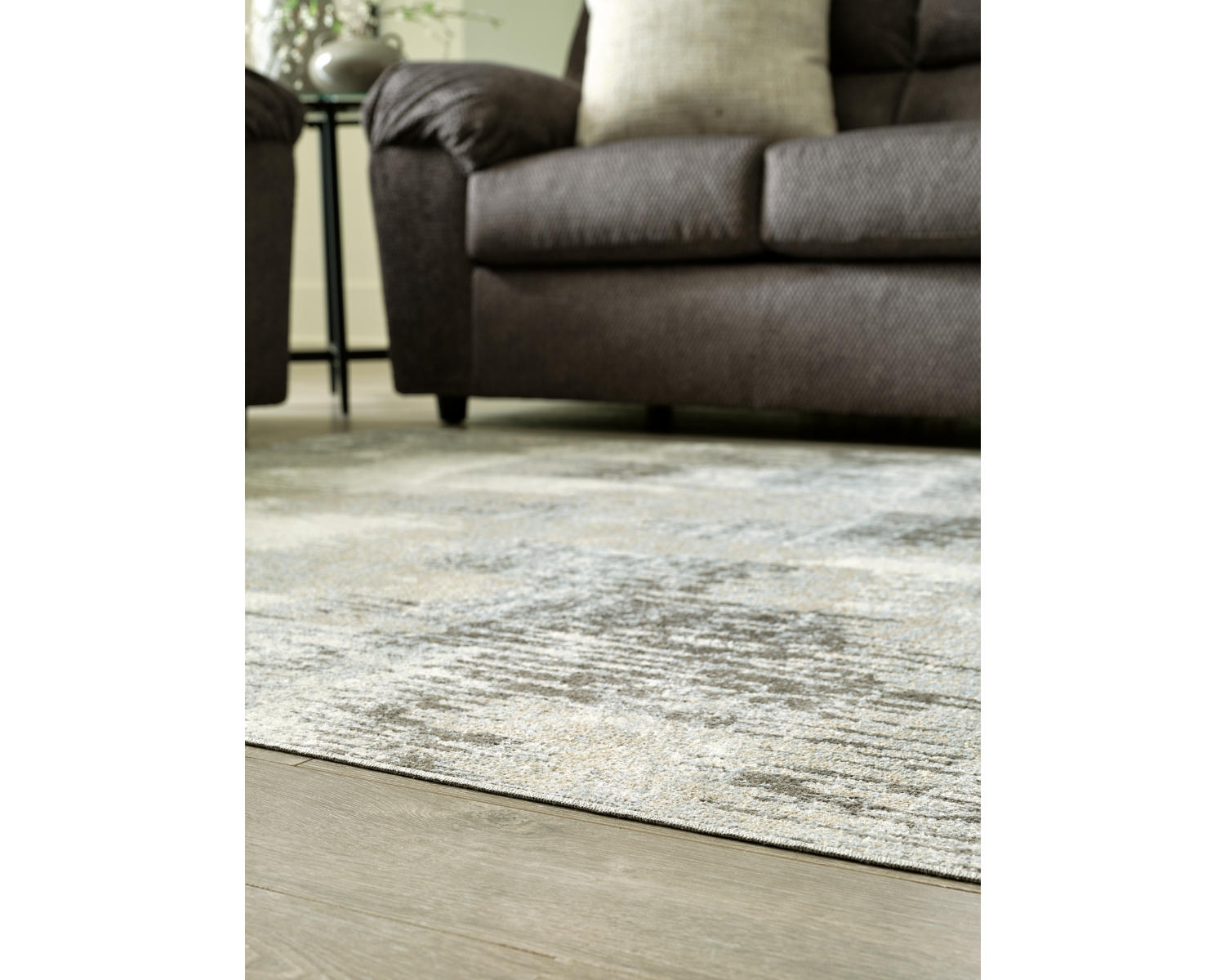Machine woven, abstract design in teal, gray, beige and taupe. 3mm pile. Polyester, backed with jute. Machine washable. Rug pad recommended.