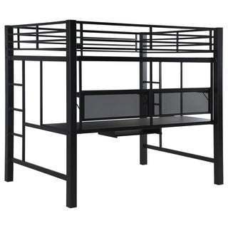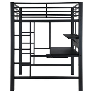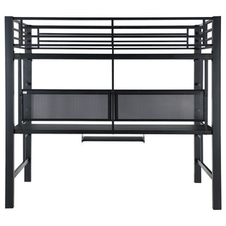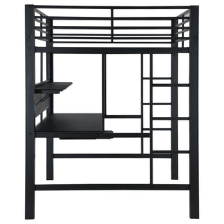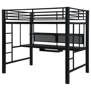 For workaholics who never stop thinking about their next great innovation, this workstation loft bed is a godsend. Combine work and sleep in a modern way with demonstrable sophistication. Metal loft bed is finished in black. Below the bed is work area that includes desk with keyboard tray and storage shelf. A delightfully contemporary addition to any living space, particularly a loft.
