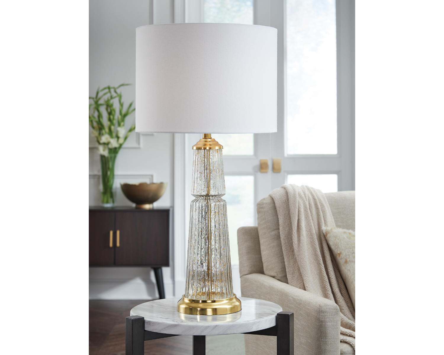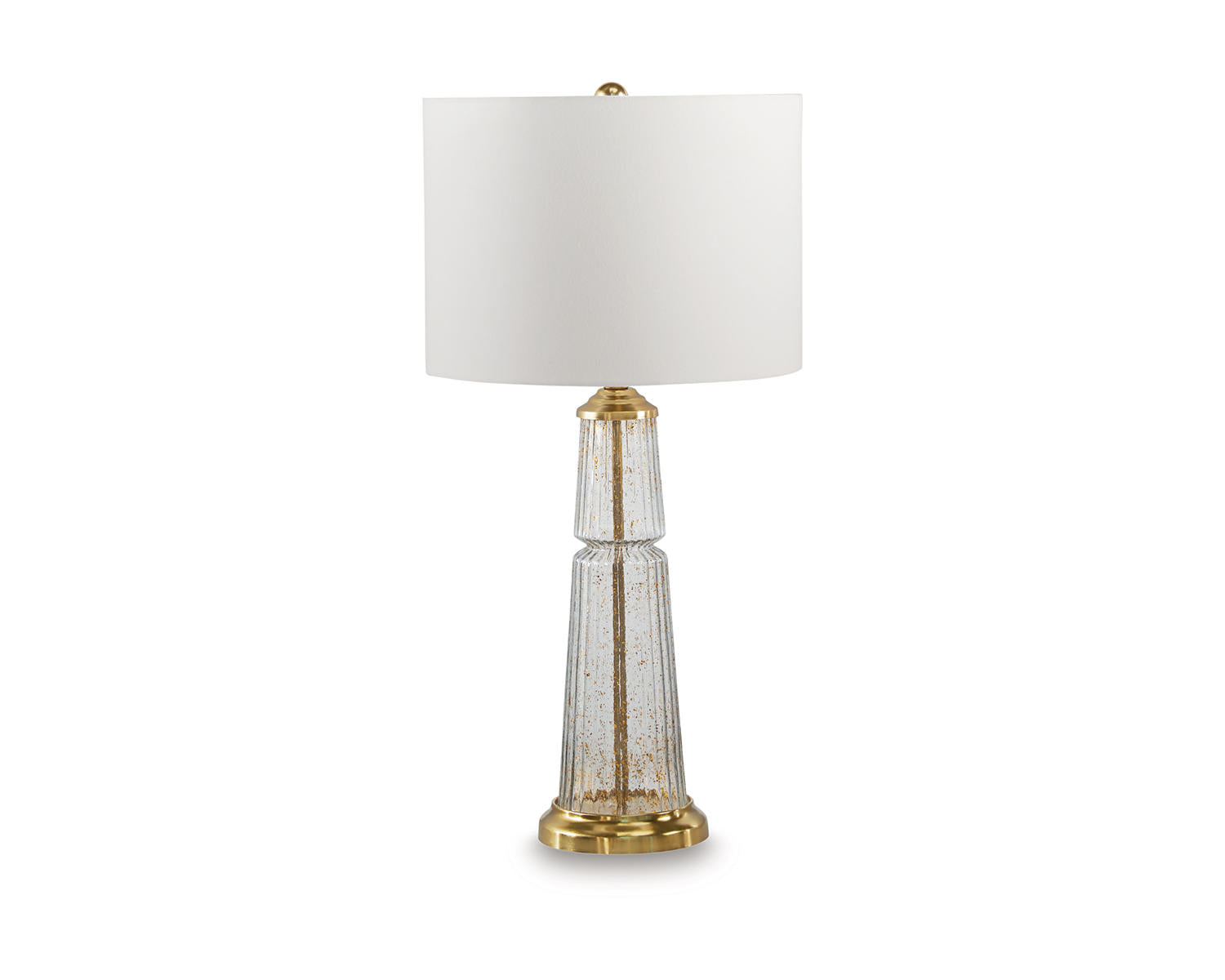 Clear fluted glass and gold finished metal table lamp. Drum hardback shade. 3-way switch. (1) E26 socket, type A bulb recommended - 150 watts max. Due to the finishing process of this product, some variations may occur.