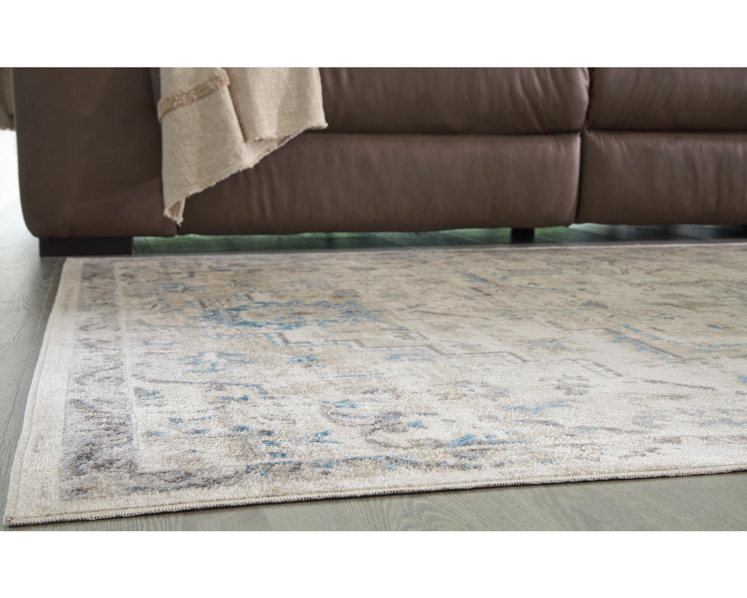 Machine woven, faux faded medallion design in tan, gray, beige, blue and charcoal. 3mm pile. Polyester, backed with jute. Machine washable. Rug pad recommended.