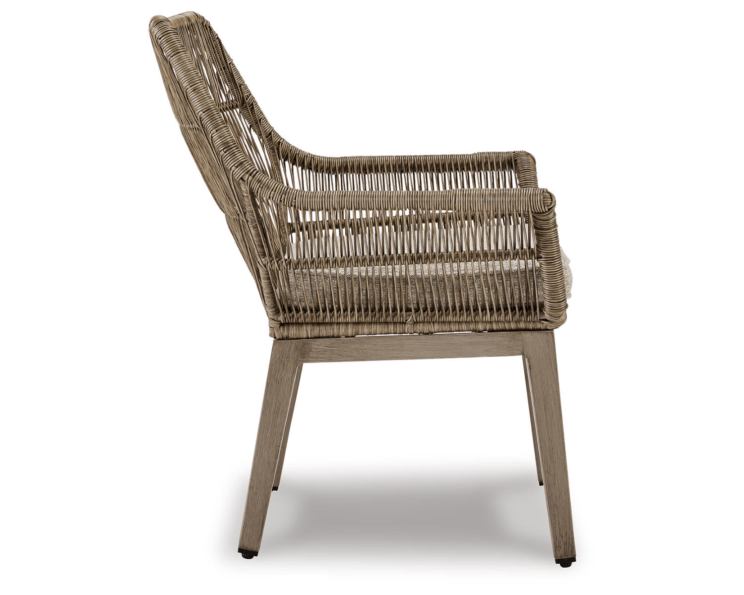 Cushioned aluminum dining set. Wood look hand applied paint finish. High performance Beige Nuvella fabric. Stainless steel hardware. Same fabric as P791 collection. Assembly required.