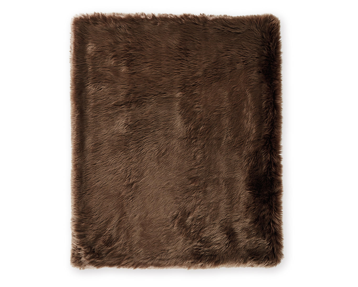 Faux fur in brown. Solid reverse in brown. Acrylic/polyester blend face with polyester reverse. Dry clean only.
