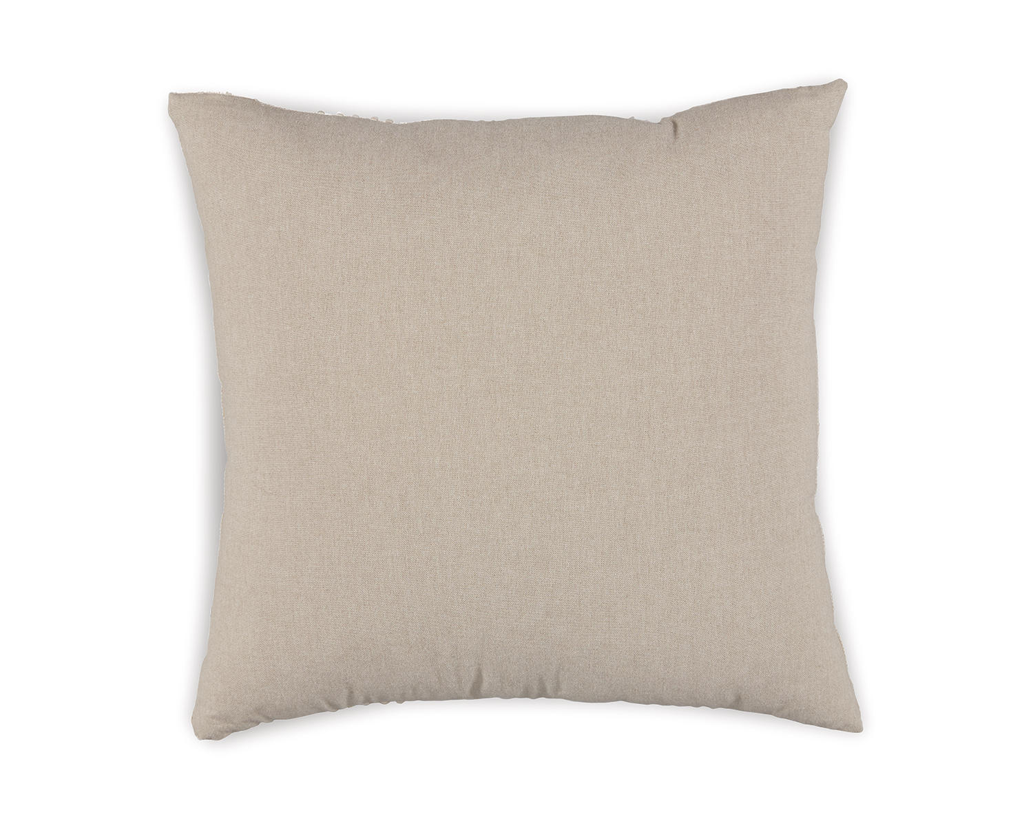 Yarn dyed stripe design in white and tan. Solid reverse in tan. Knife edge construction. Cotton cover. Zipper closure. Fiber filled. Machine washable cover.