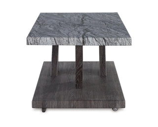 Contemporary styling. Made with decorative paper laminate and MDF substrate. Two-tone finish consisting of faux gray marble tops and weathered gray wood grain legs and shelf. Cocktail table features casters for easy mobility. 3-in-1 pack.