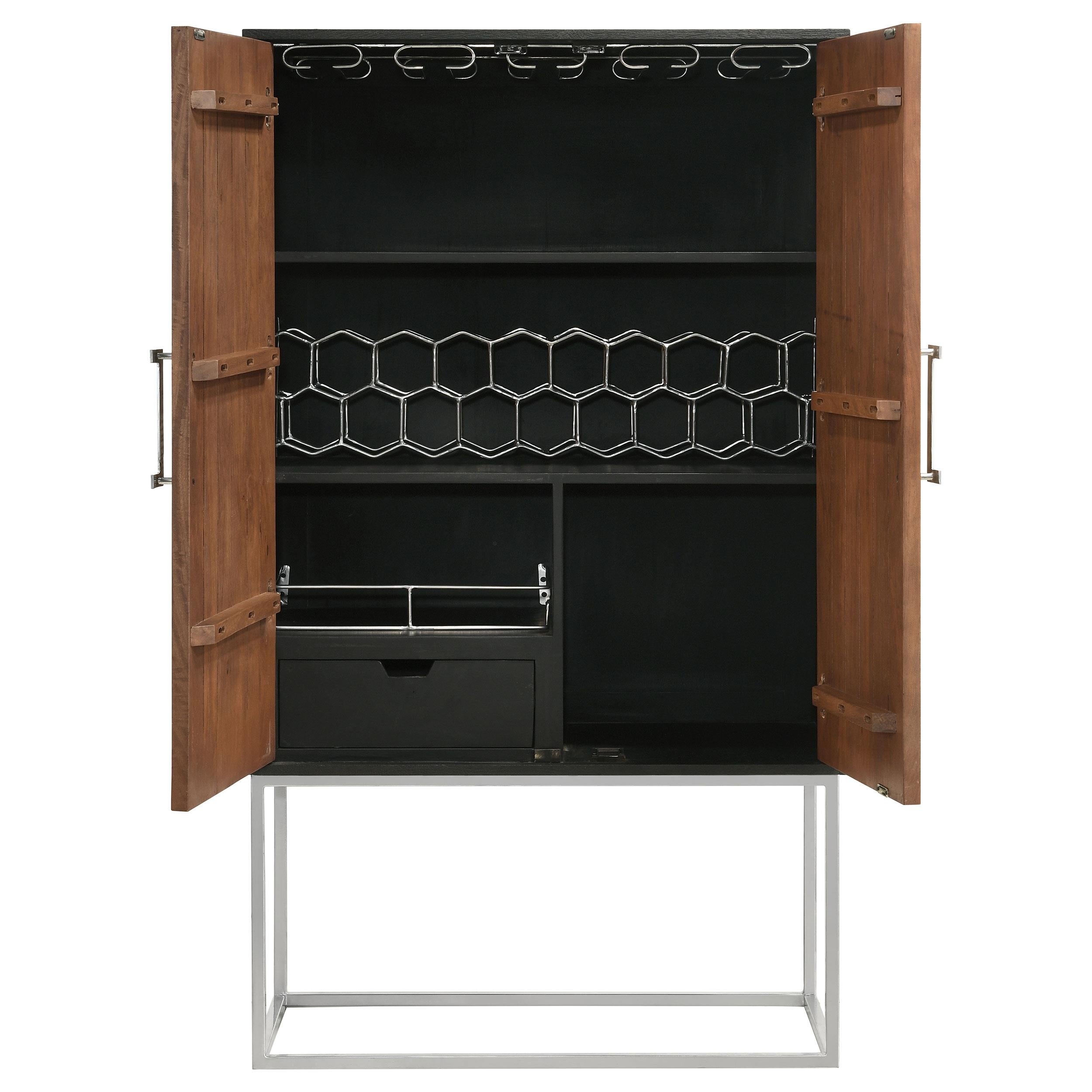 Get the party started with a sophisticated, contemporary bar cabinet. Closed, it's simply a stylish cabinet, complete with decorative checkerboard door fronts and geometric handles that catch the eye in a living or dining room. When opened, the cabinet reveal plenty of space for all your wine and cocktail needs, complete with two interior shelves to keep everything at your fingertips. The cabinet is crafted from mango wood, with a warm walnut finish on its doors and a black case finish. The cabinet is elevated on an iron base that receives a classic silver finish, delivering height and lightness to the overall look of the piece.
