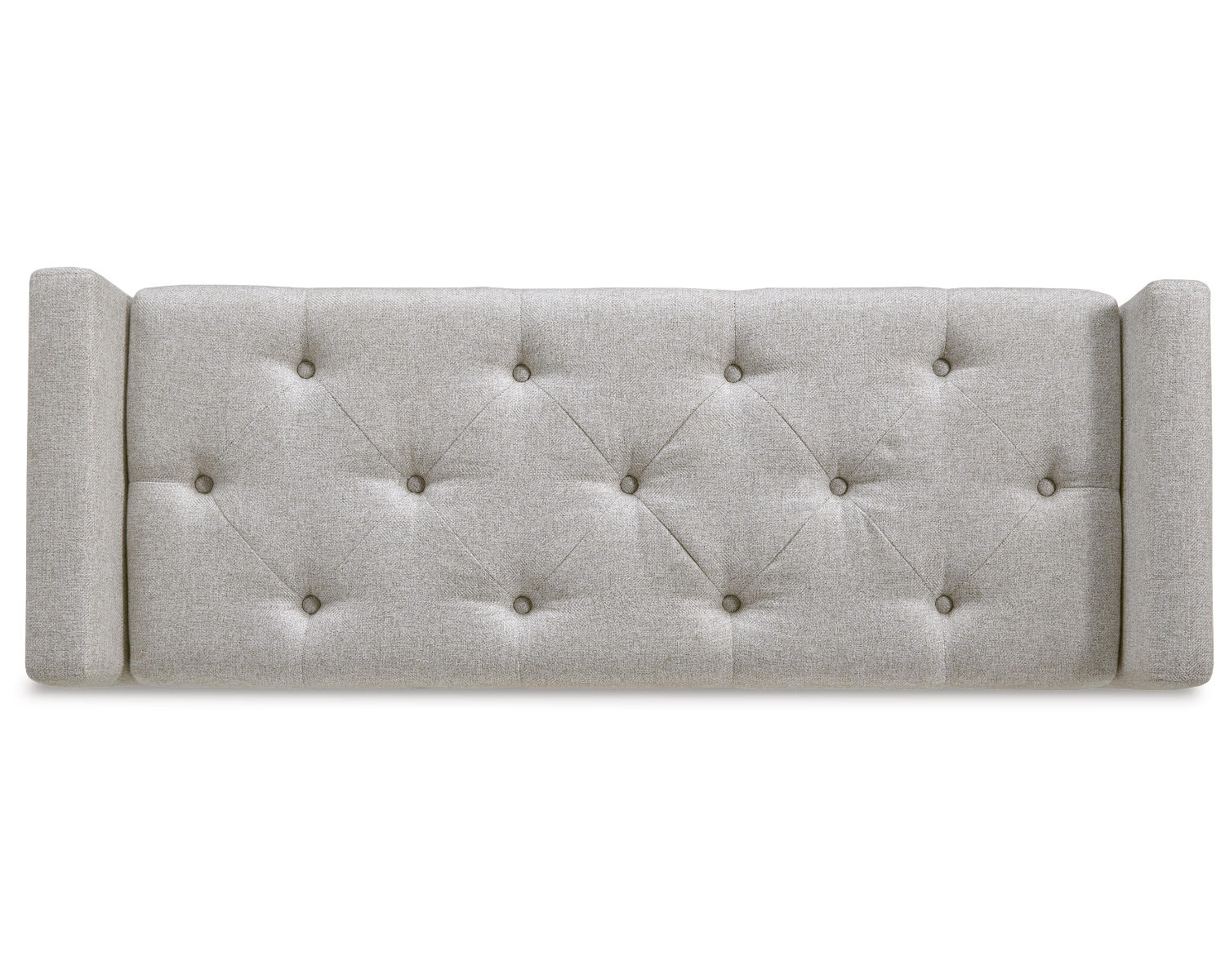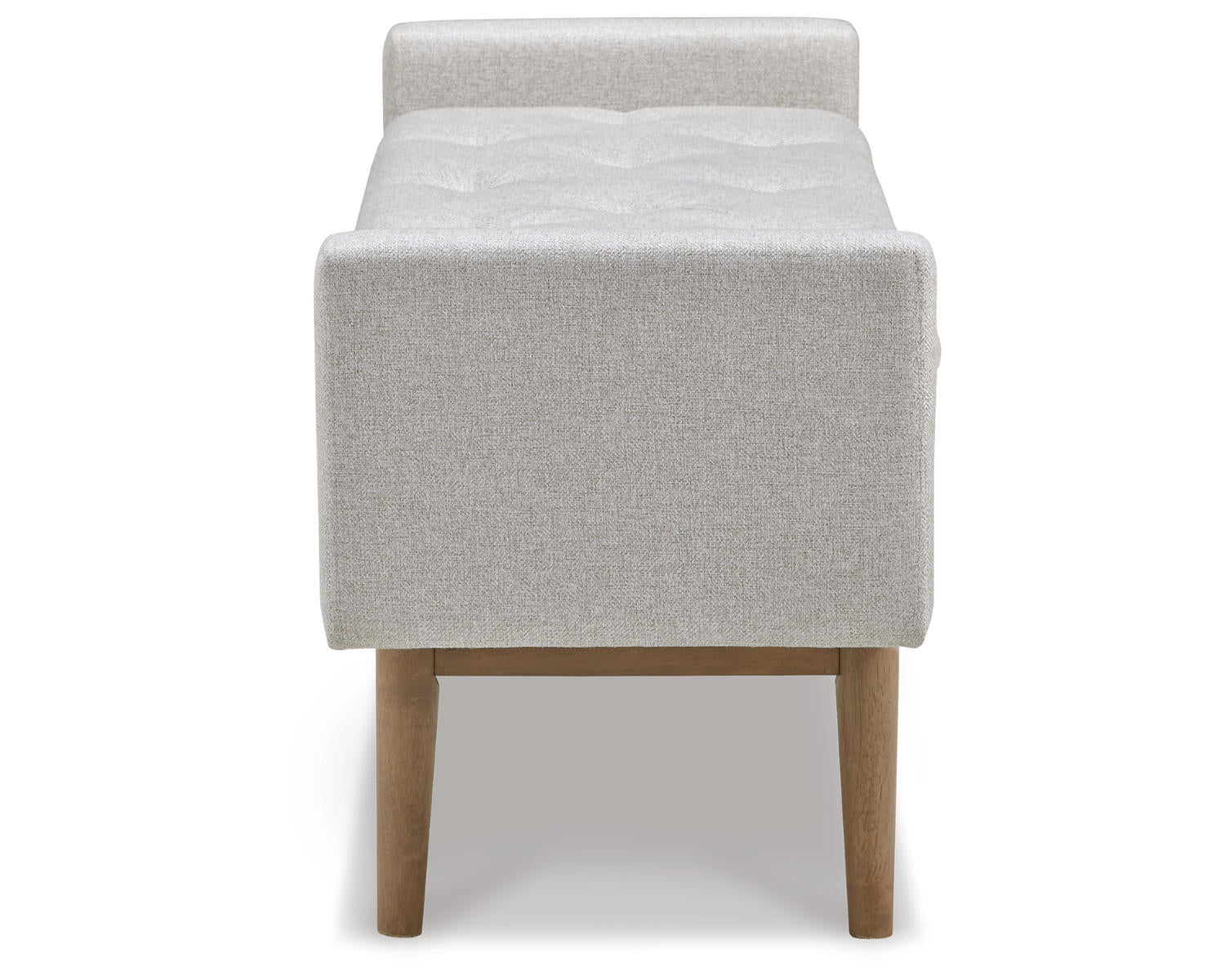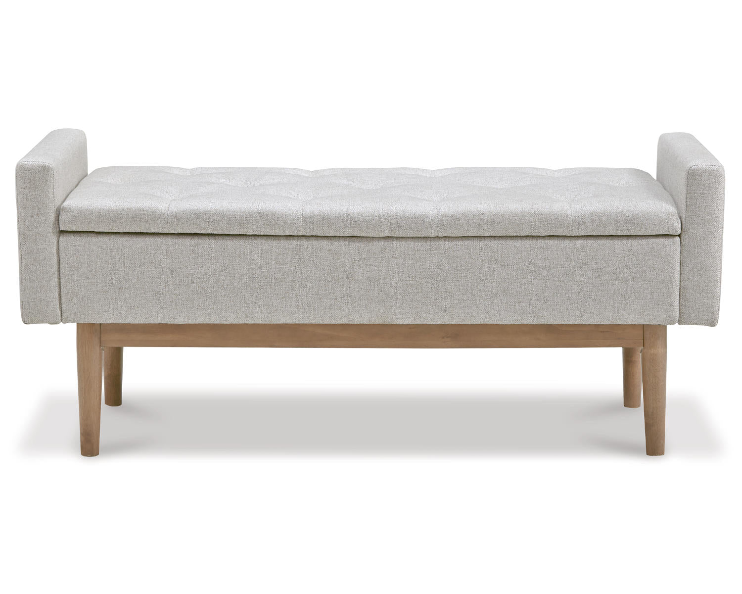 Contemporary style gets practical with this bench. The tufted beige seat cushion is hinged to allow easy access to whatever you need to hide in plain sight. The raised edges give the impression of arms on this cushioned seat while the light brown finished wood legs help it blend with many different modern styles.