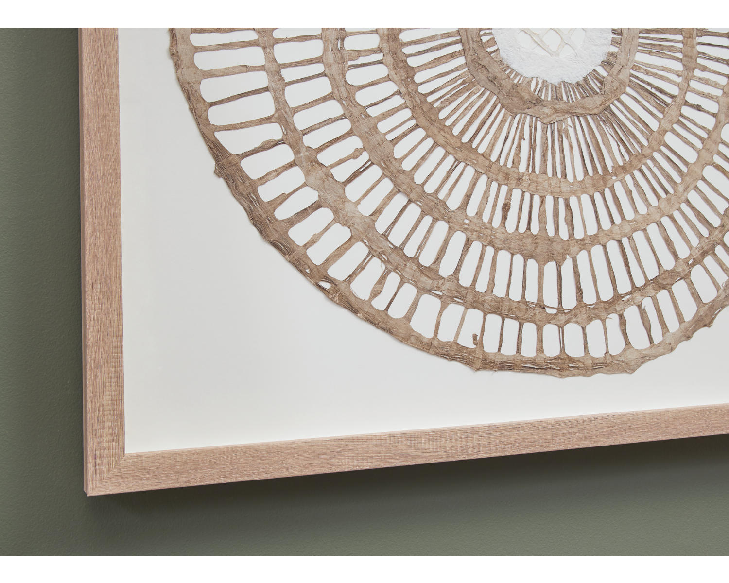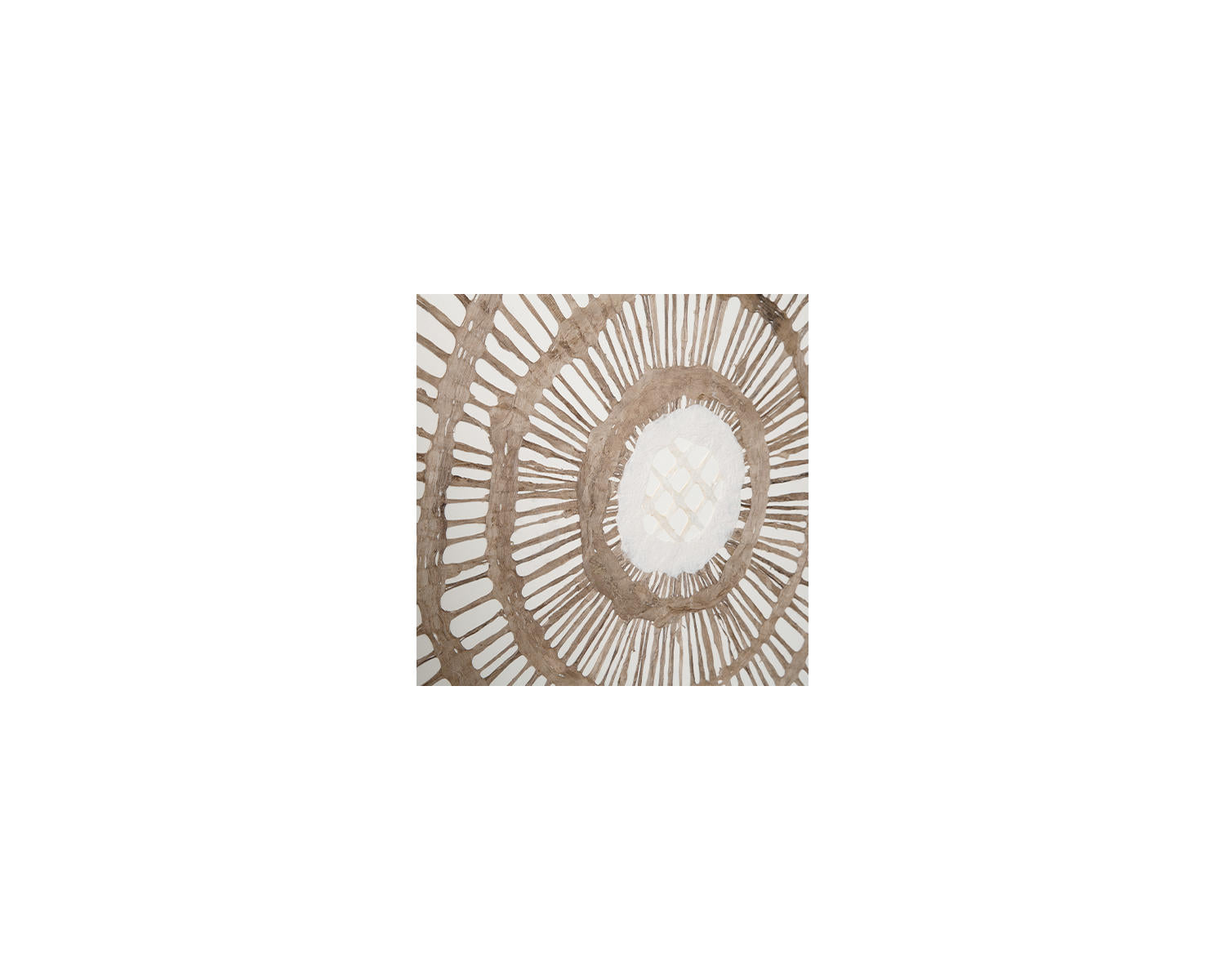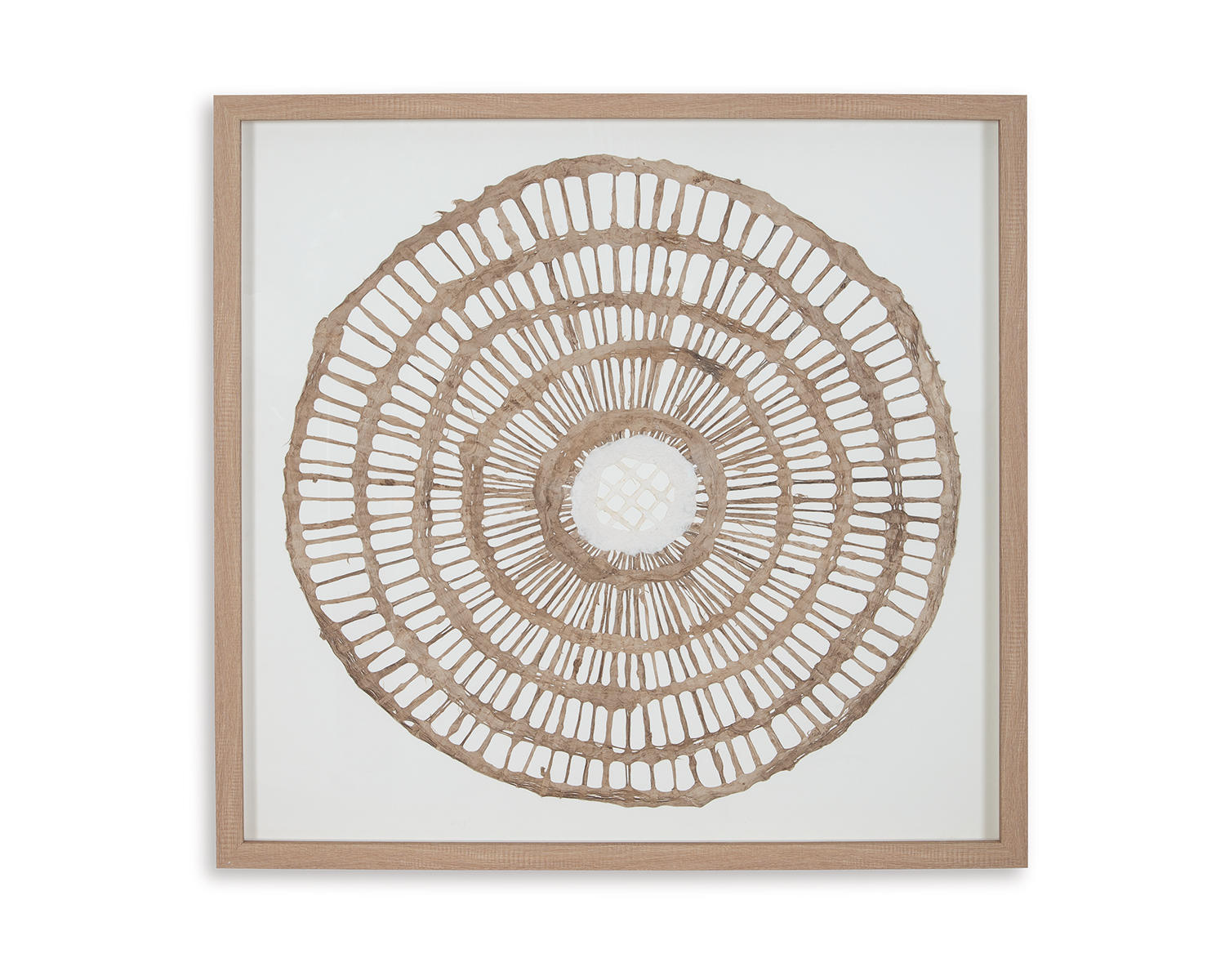 Brown finished framed wall sculpture. Geometric design in brown paper under acrylic. D-ring bracket for hanging. Due to the use of natural materials, some variations may occur.