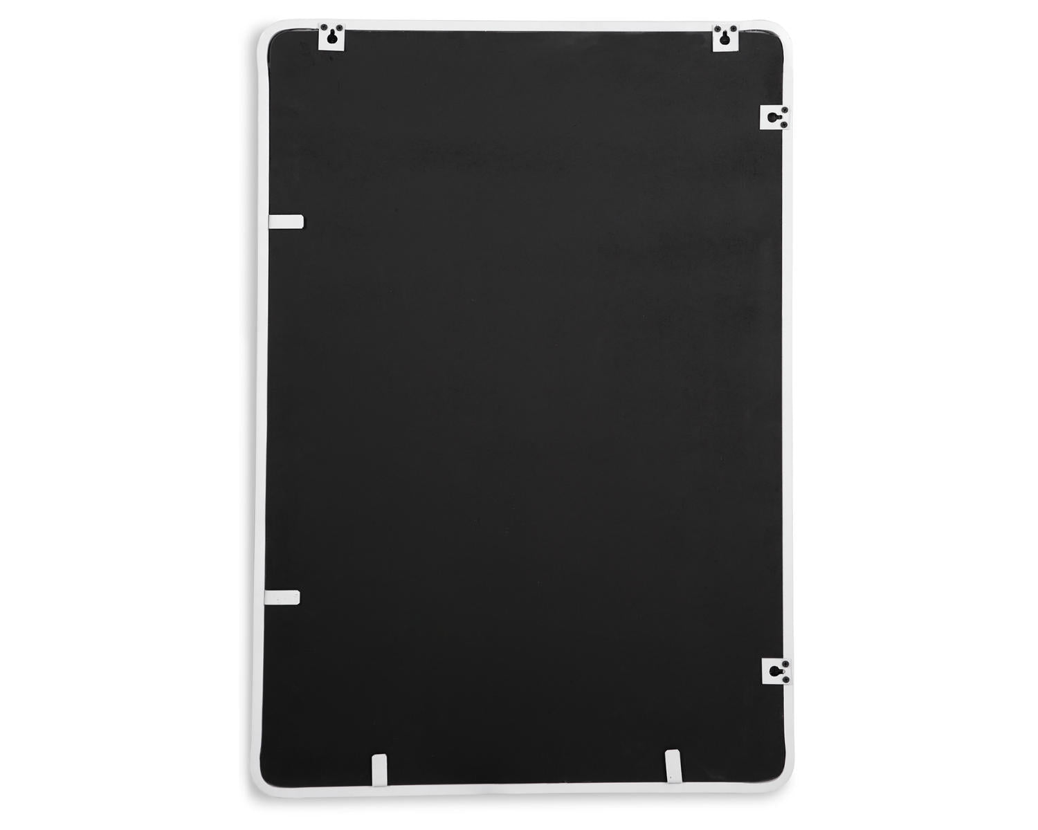White finished metal accent mirror. Keyhole bracket for hanging. Vertical and horizontal hanging.
