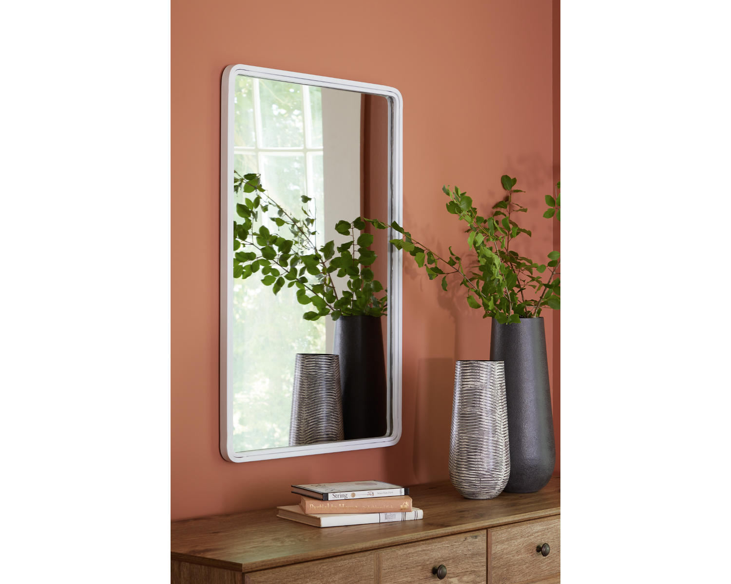 A clear reflection of your good taste, the simple shape of this mirror is given depth and dimension with the addition of a thick metal frame. A simple white finish gives it the perfect modern appeal. This piece is just right in a hallway, powder room, or above a console.