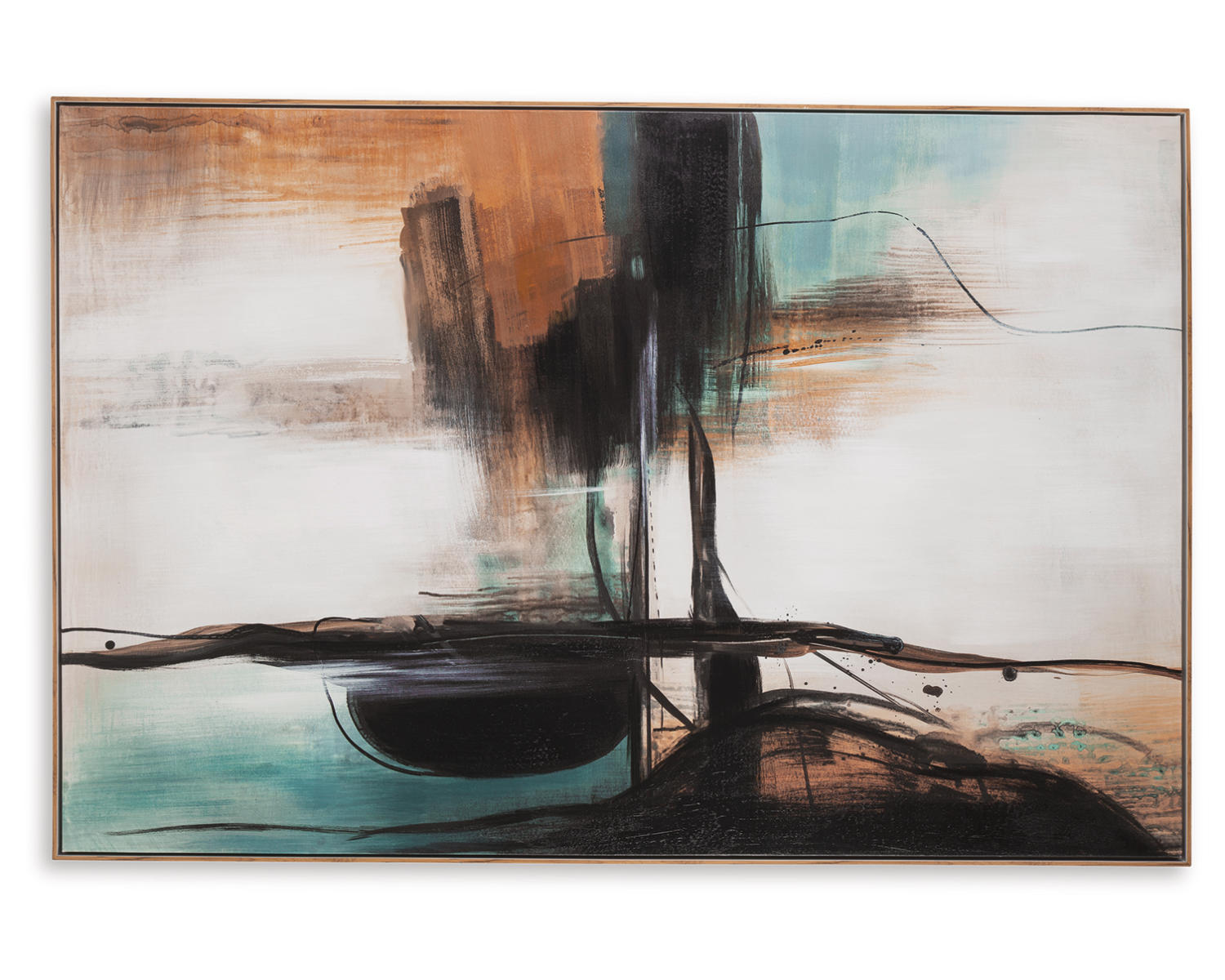 Abstract design in shades of teal, orange, black and white. Framed gallery wrapped canvas. Hand painted embellishment. D-ring bracket for hanging. Vertical and horizontal hanging. Due to the hand crafted nature of this product, some variations may occur.