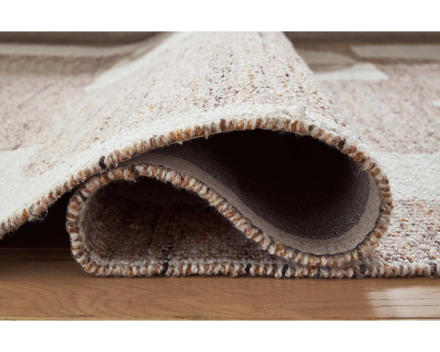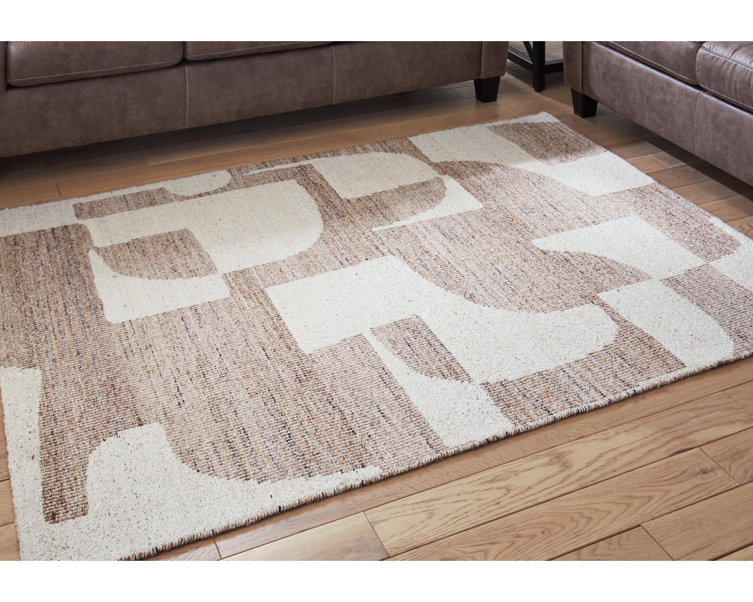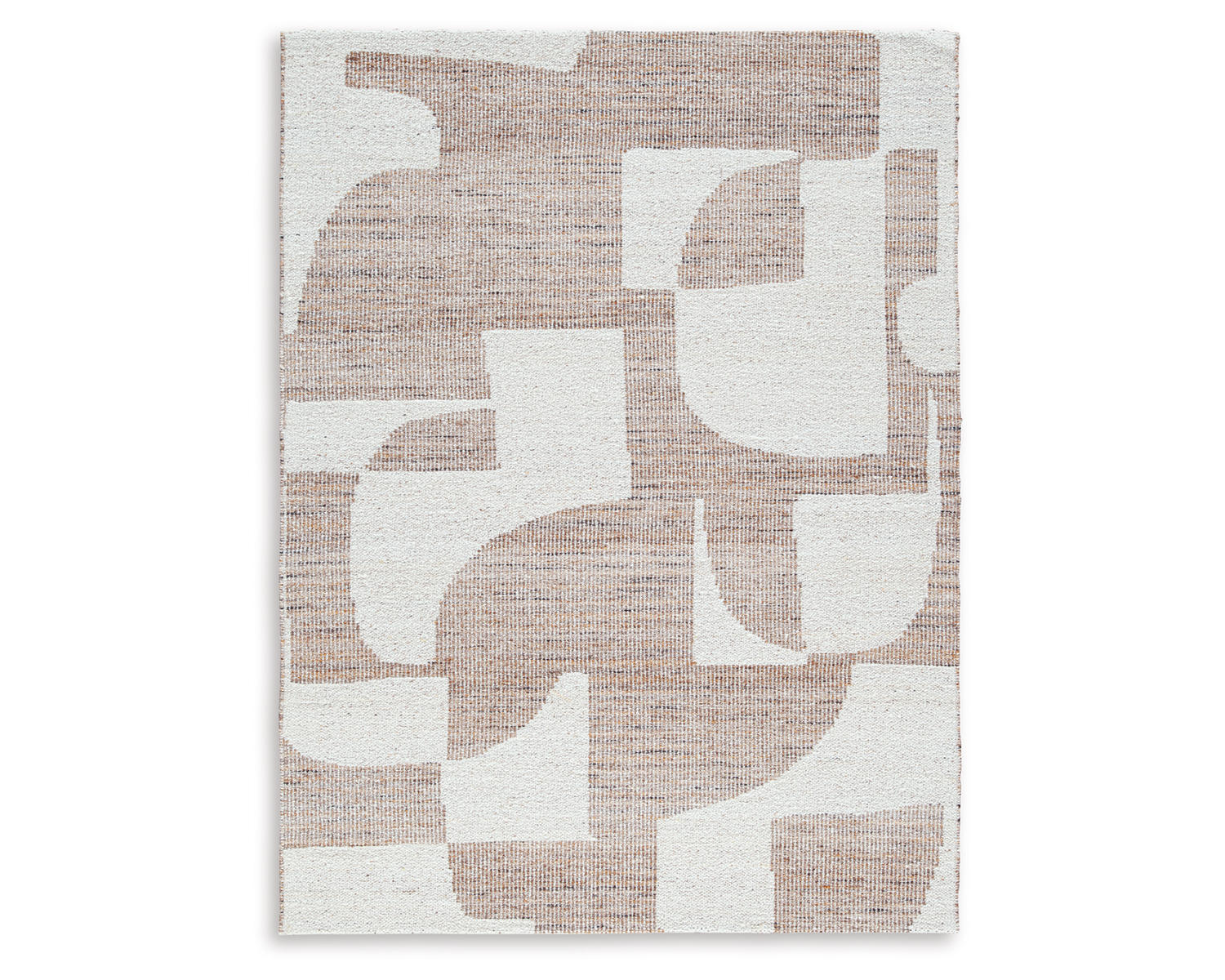 Hand woven, abstract design in shades of brown and beige. No pile. Polyester, backed with cotton. Spot clean only. Rug pad recommended. Due to the handcrafted nature of this product, some variation may occur.