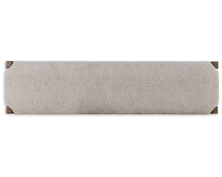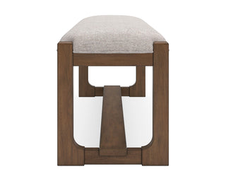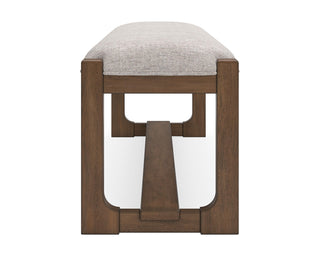 This dining bench sits comfortably at the intersection of modern lodge and farmhouse aesthetics. Your warm and welcoming disposition is reflected in its charming architectural elements and neutral textural fabric. Even with its poise, the bench remains practical. Its cushioned seat invites you to linger longer at the table, defining your dining room with reliable function and style.