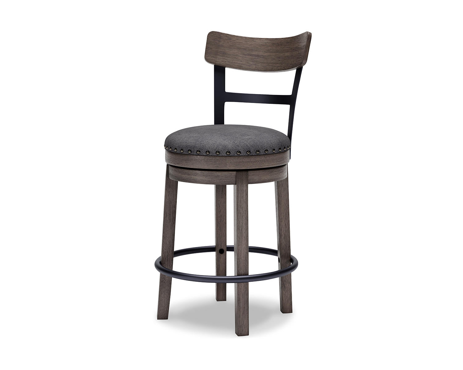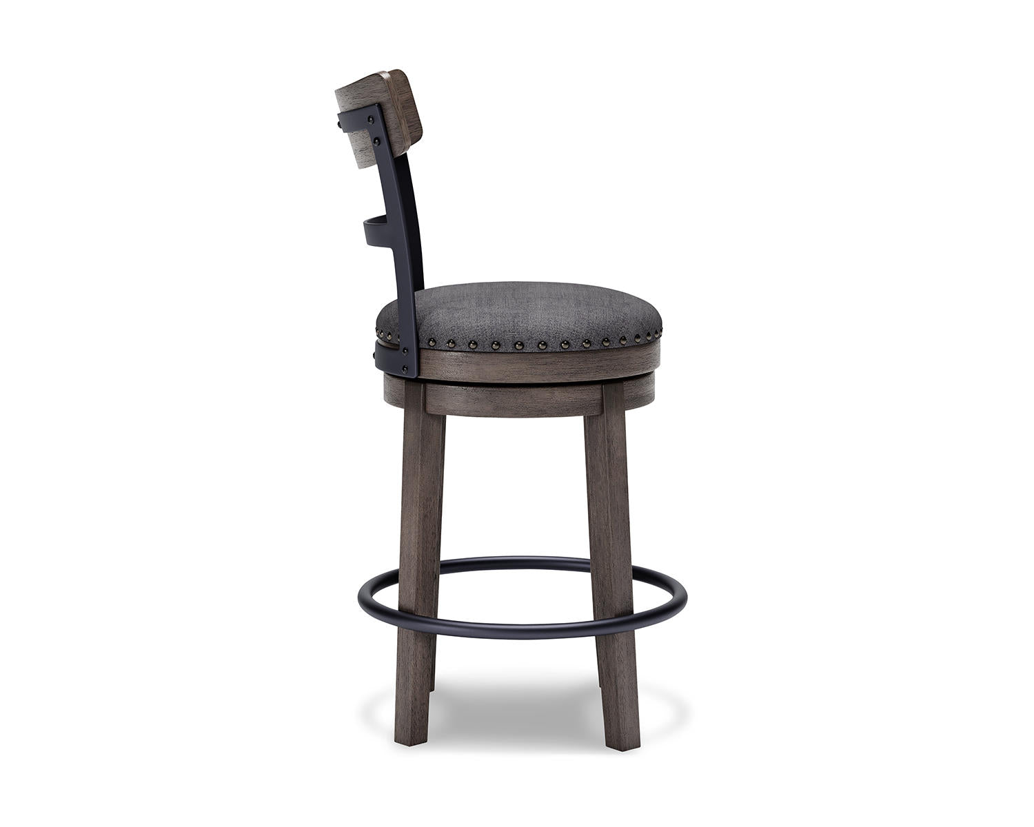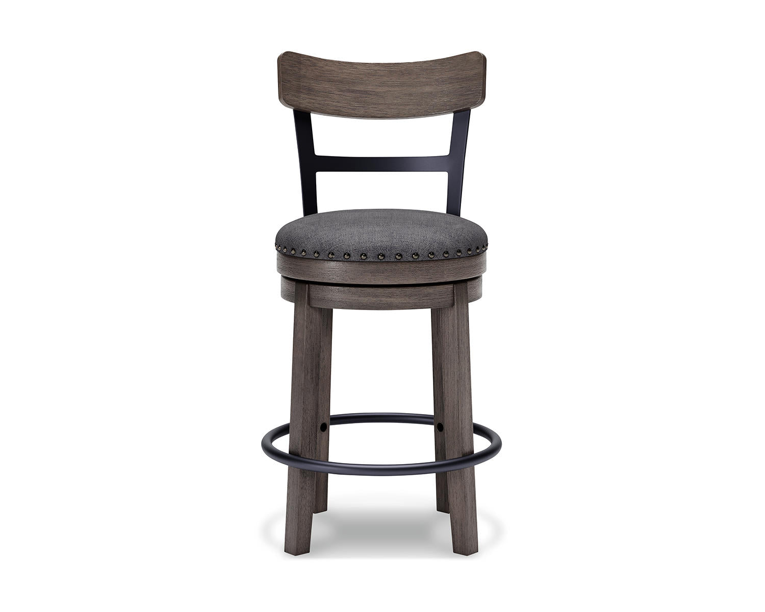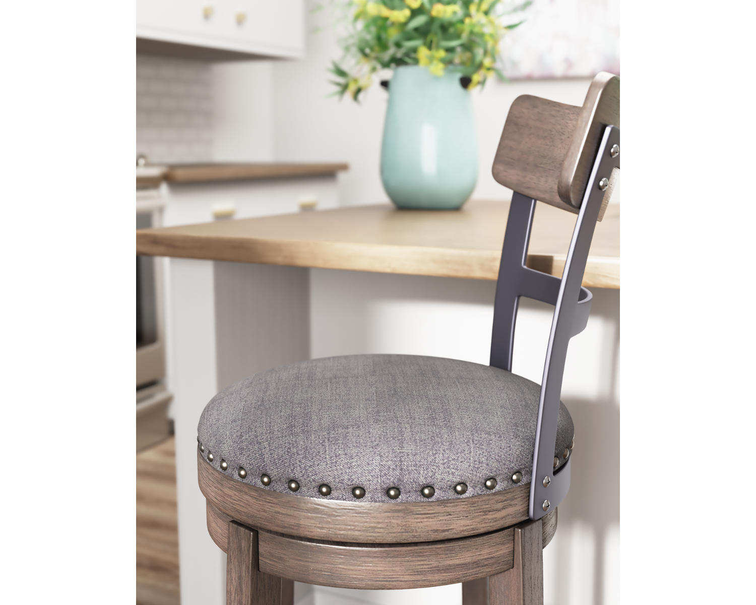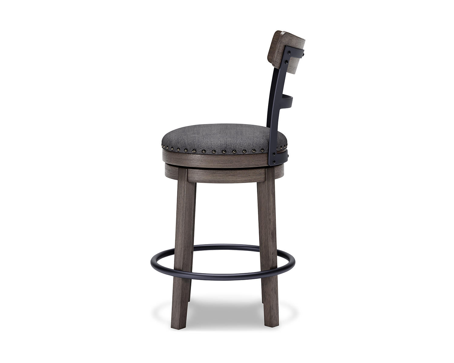 Bring a relaxed yet refined sense of good taste to a space with this upholstered swivel bar stool. The sturdy wood frame with contoured backrest is beautified with an antiqued gray wash finish that’s easy on the eyes. Rest assured, this bar stool caters to your comfort with a cushioned seat with gray textured fabric accentuated with nailhead trim. Sensible swivel design keeps you in the flow of conversation.
