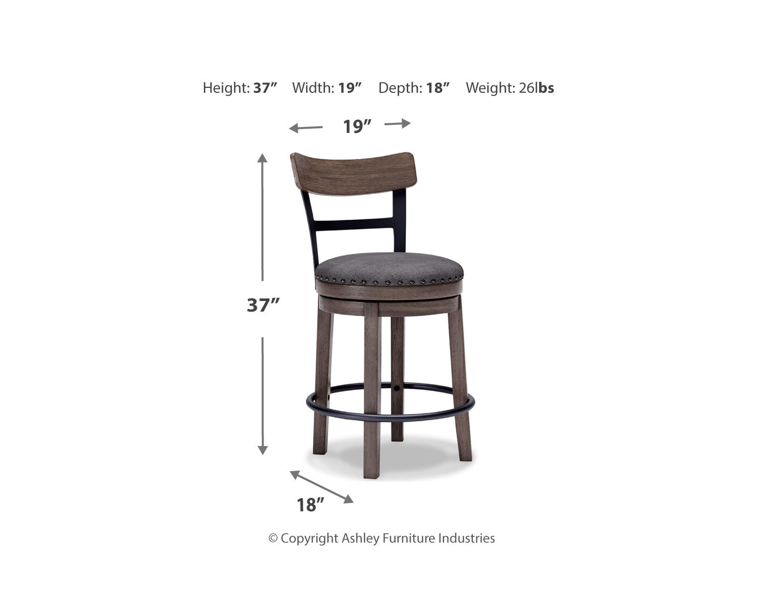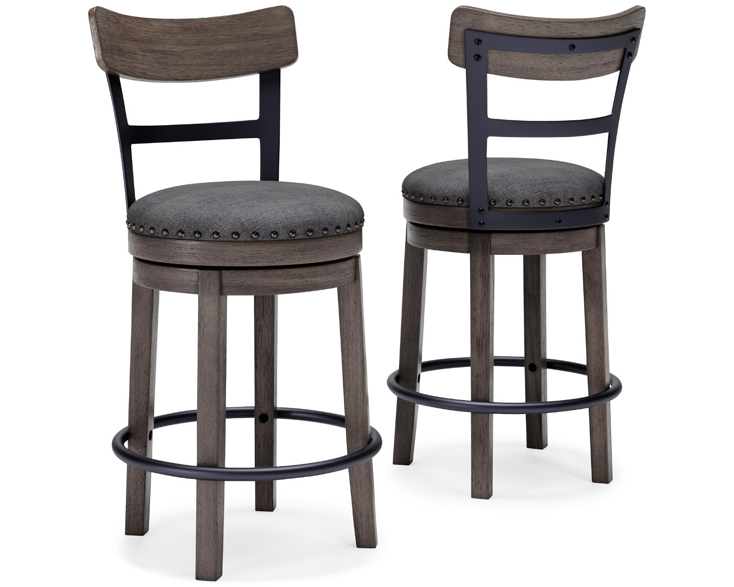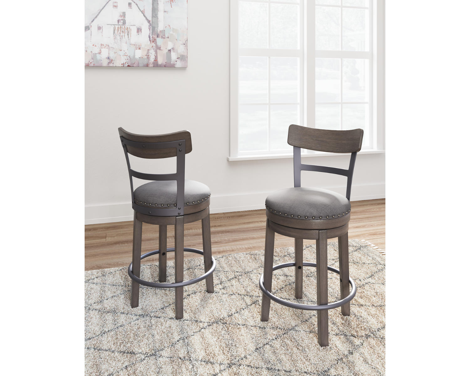 Casual lifestyle design constructed with Acacia veneer and solids. Finished in an antiqued gray wash color. X-back chairs feature solid wood frame and cushioned seat covered with a gray textured polyester fabric with nail head trim. Matching backless bench features nail head trim. D388-425 rectangular dining table and six X-back chairs. Chairs feature solid wood frame and cushioned seat covered with a gray textured polyester fabric with nail head trim. D388-425 chair dimensions: 19"W x 22"W x 38"H. D388-224/230 has solid hardwood frames with metal back supports and footrest. Swivel seats feature a gray textured polyester fabric with nail head trim. Finished in an antiqued gray wash color. D388-423 table made with hardwood solids, Acacia veneer and MDF substrate. Stools are made with hardwood solid frames and foam cushioned seats with a polyester fabric. Antiqued gray wash finish. D388-423 includes 6 upholstered stools and counter height table.