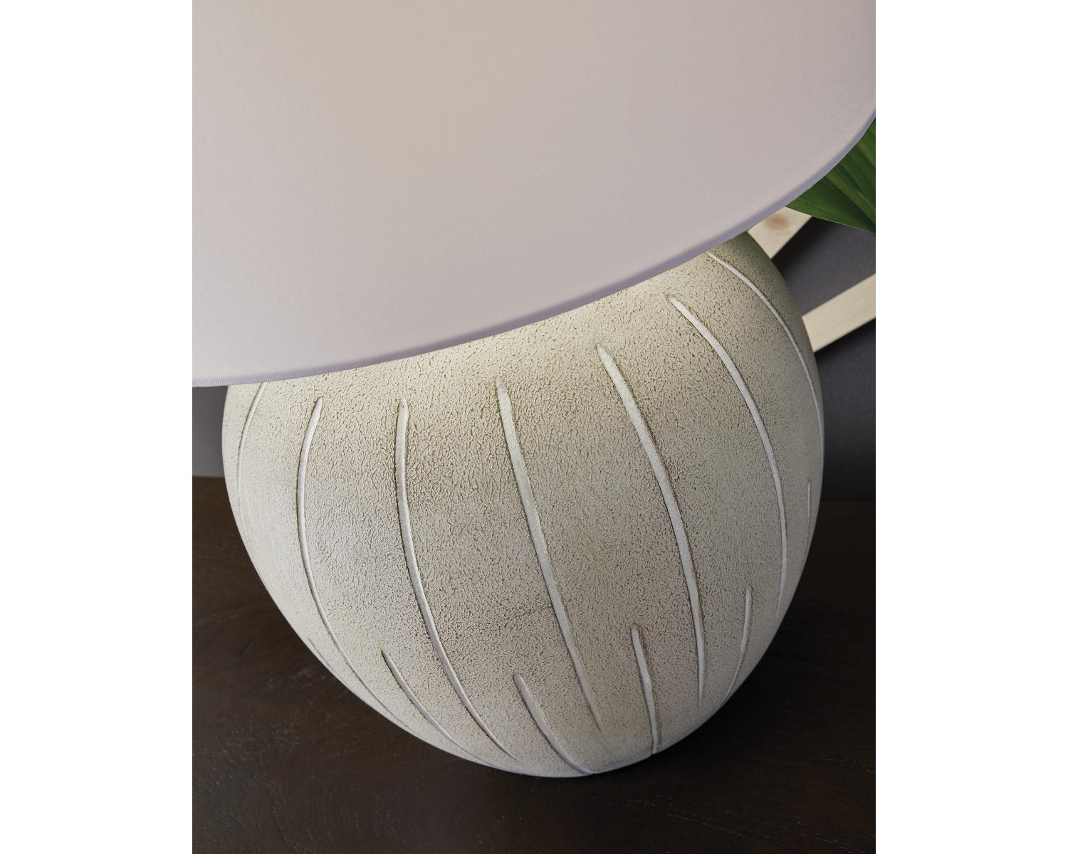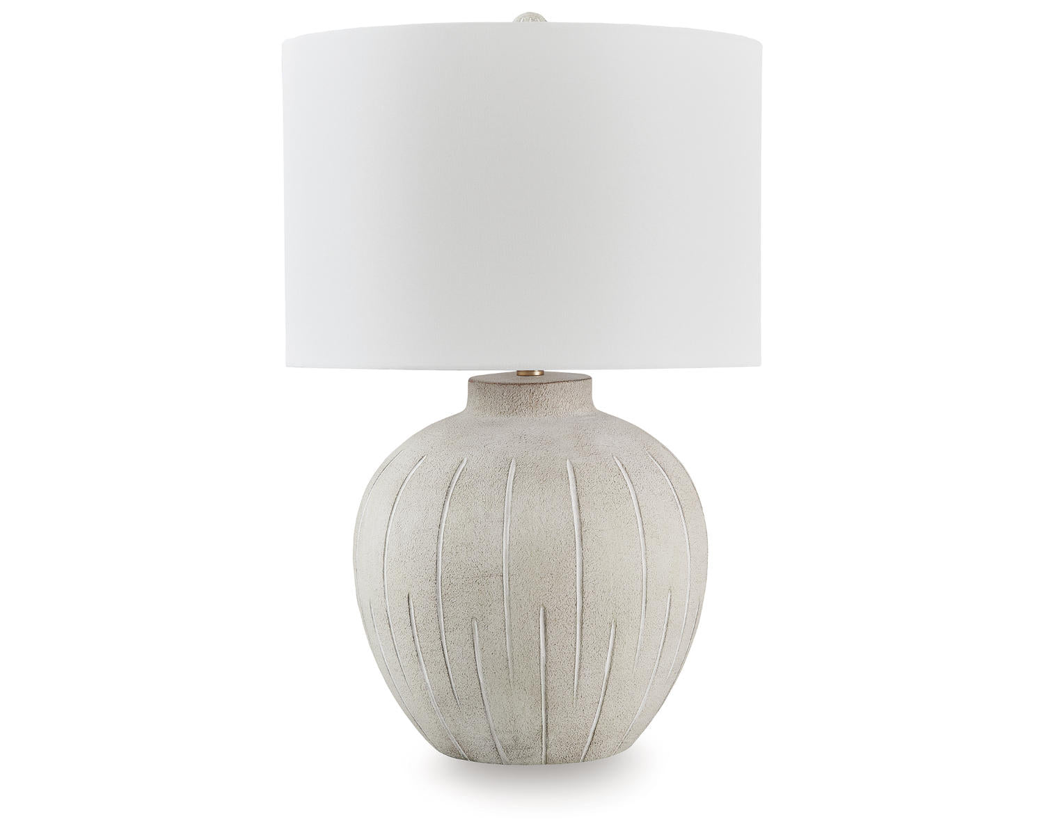 Warm gray and white antique finished poly resin table lamp. Drum hardback shade. 3-way switch. (1) E26 socket, type A bulb recommended - 150 watts max.