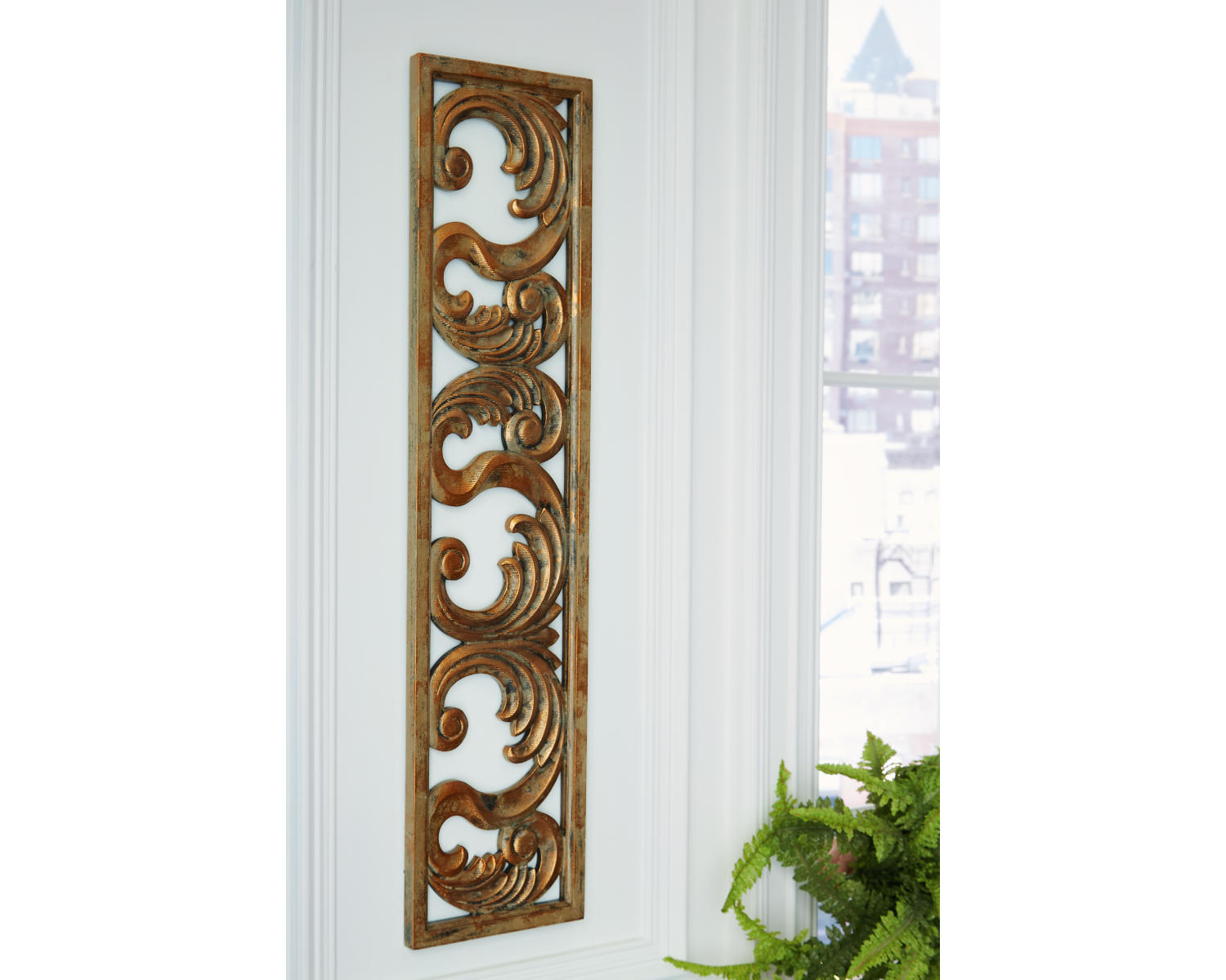 Grace your home with an epic, expensive feel without breaking the bank. This wall sculpture's stately scrollwork design is dressed in an antiqued goldtone finish. Hang it in your entryway to set a tasteful tone, or place it next to picture frames on a gallery wall to create a polished and poised look.