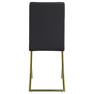 Add bold sophistication to your dining area with this contemporary side chair in black leatherette. Designed with clean lines and a sculptural brass metal base, it delivers striking modern elegance. The high back and plush padding provide comfort, while the armless design keeps the silhouette sleek. Pair it with a glass or lacquered table to complete the upscale look.