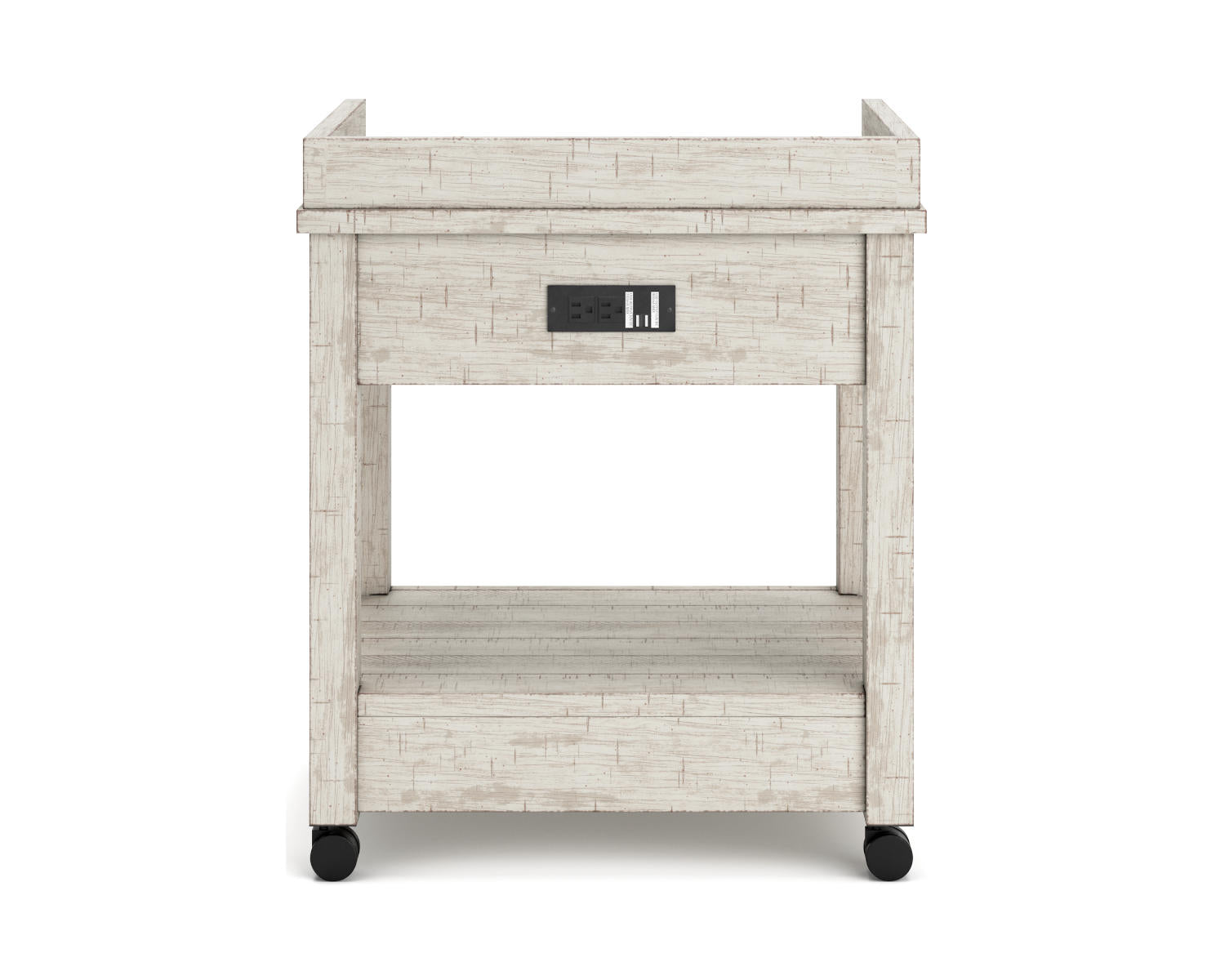 Made with Pine veneers and solids, finished in a distressed white washed color. Leg desk has canted base and two drawers for storage. Printer stand features two drawers and a lower shelf, casters for mobility and an AC power supply with (2) USB charging ports in the back side. Accent bookcase has cross buck support structure behind the shelves.