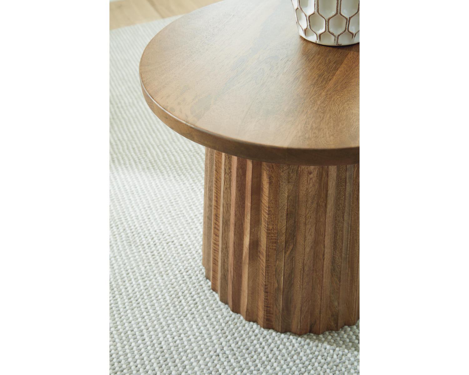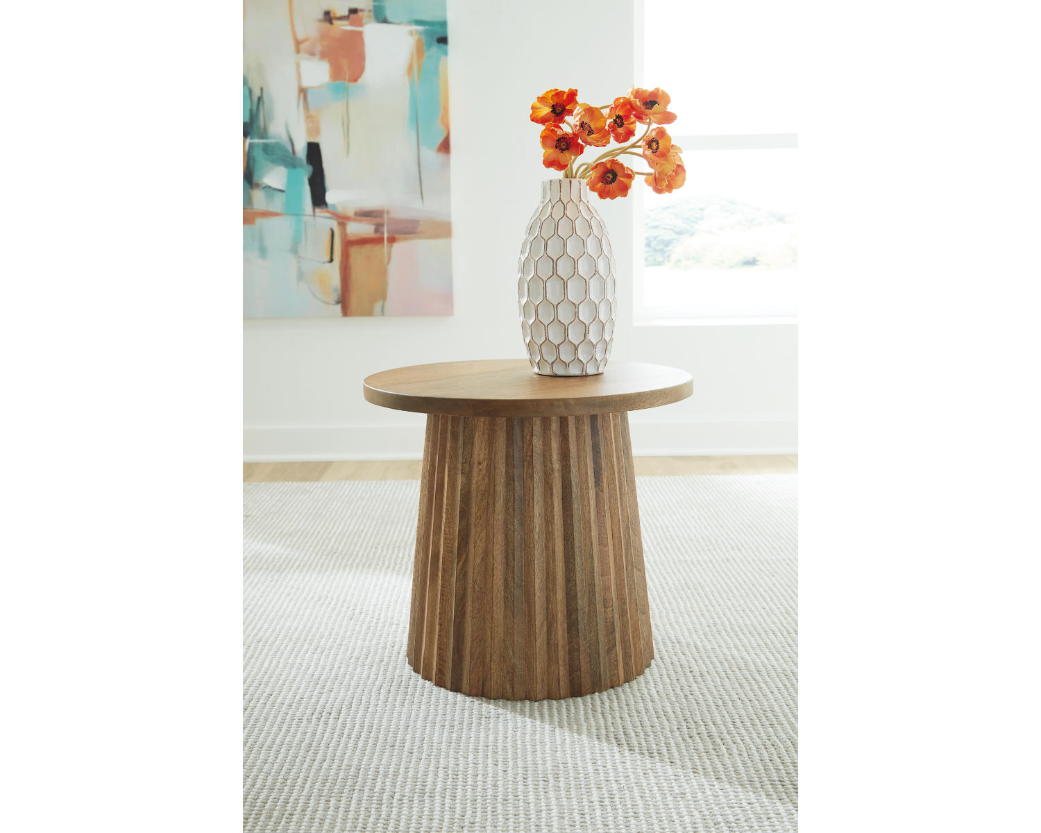 Accent table. Constructed of solid wood in wire brushed natural finish. Fluted base design. Coordinates with A4000601 and A4000603.