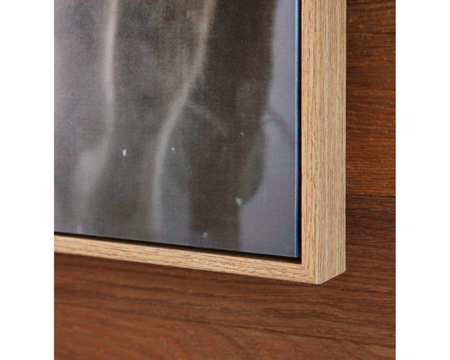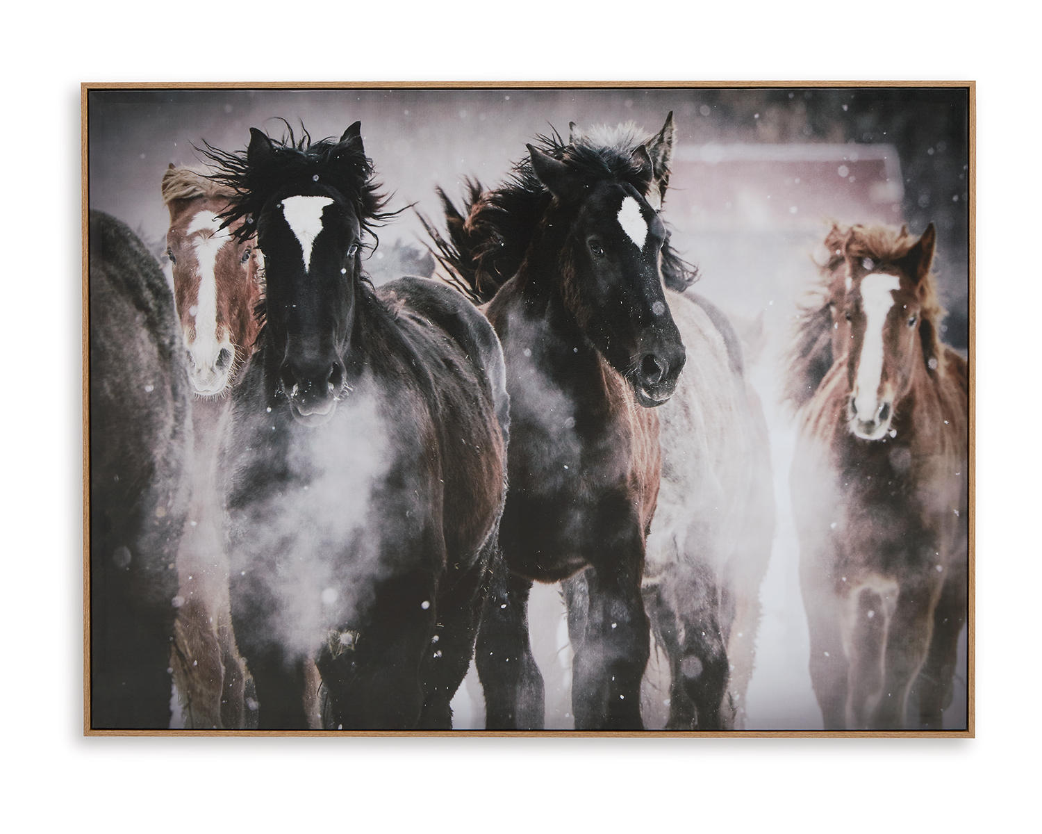 Horses in brown, black and white. Framed gallery wrapped canvas. D-ring bracket for hanging. Horizontal hanging only.
