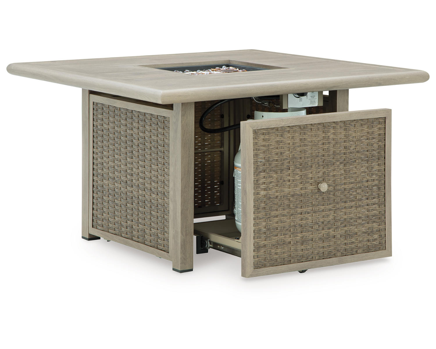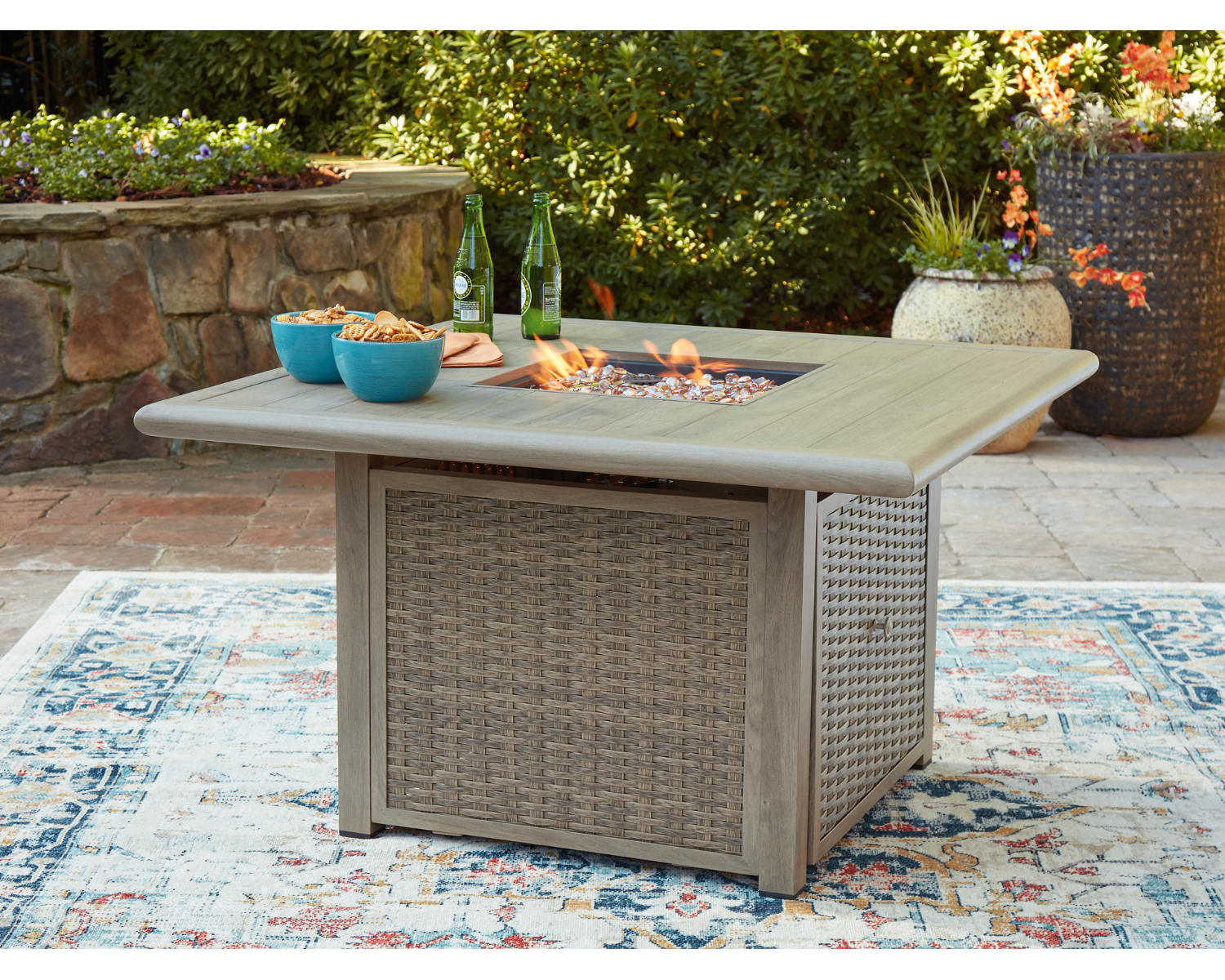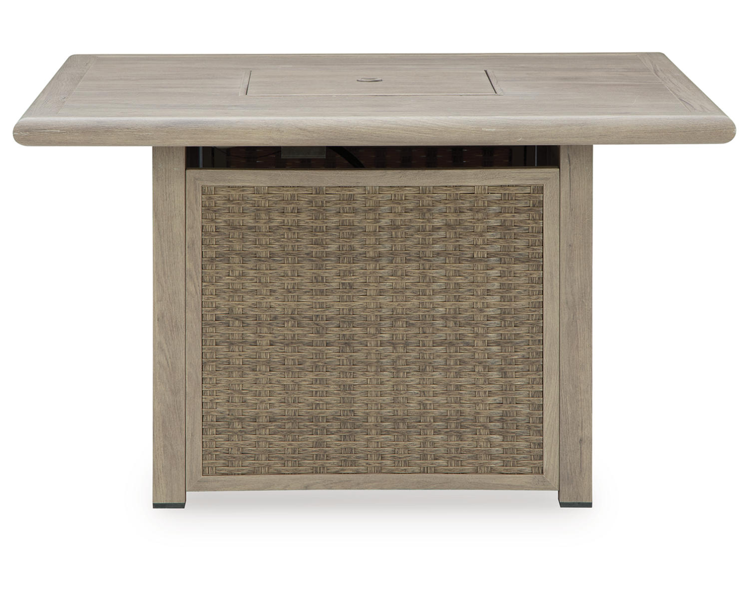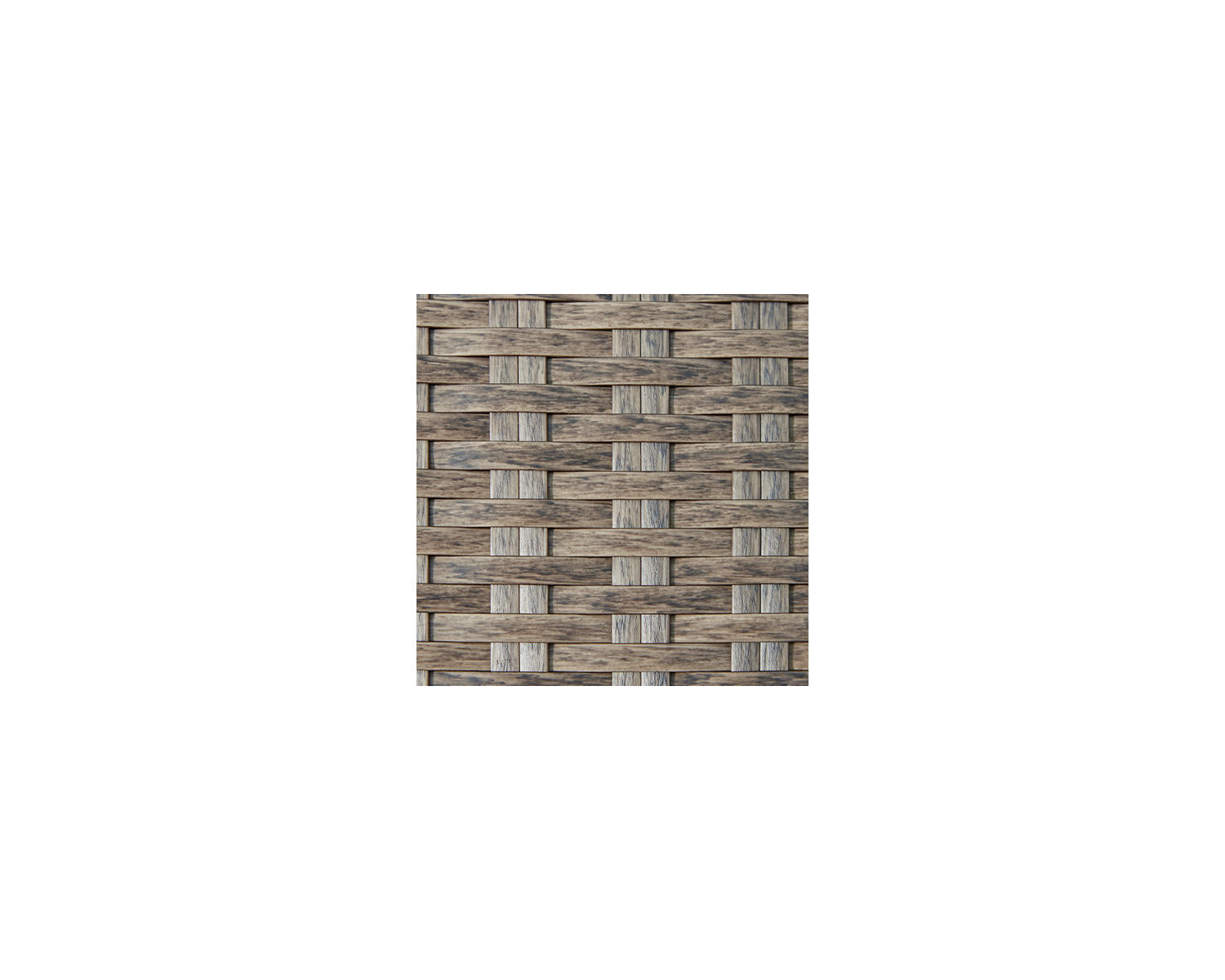 Aluminum/resin wicker. Quick dry foam. Wood-look. P690-772 includes 30,000 BTU stainless steel burner, glass beads, protective weather cover, adjustable flame control and battery included. Assembly required.