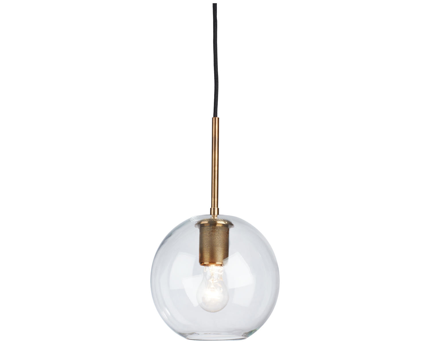 Clear glass and antique brass metal pendant light. Hardwire. (1) E26 socket, type A bulb recommended - 60 watts max or 13 watts max CFL.