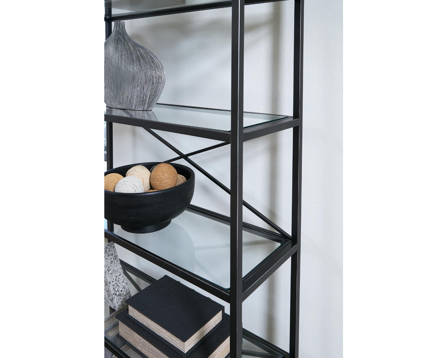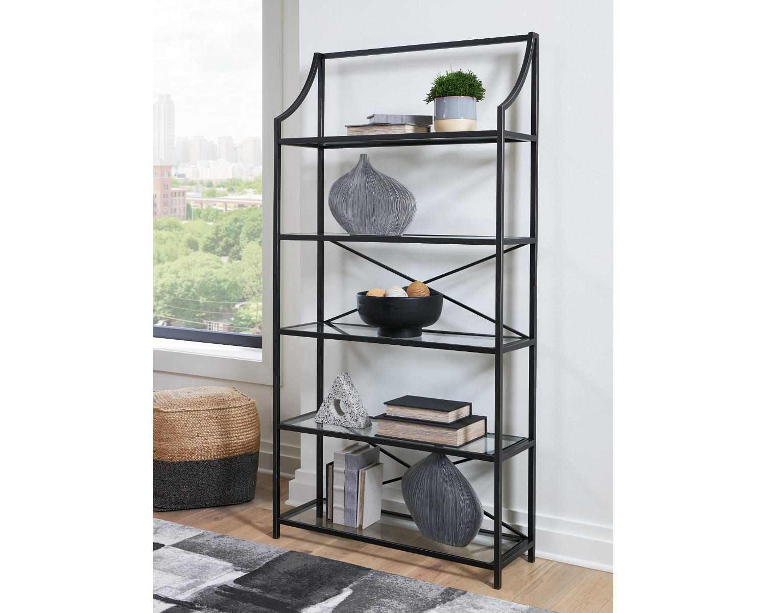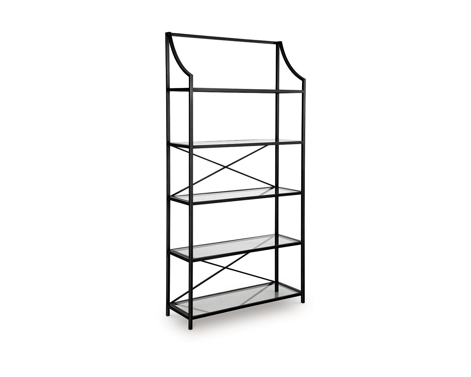 This bookcase proves that traditional designs are simply timeless. Five spacious glass shelves offer plenty of room to display today's meaningful mementos and awesome accessories. With a classic antiqued black finish, it’s just got that ageless appeal.
