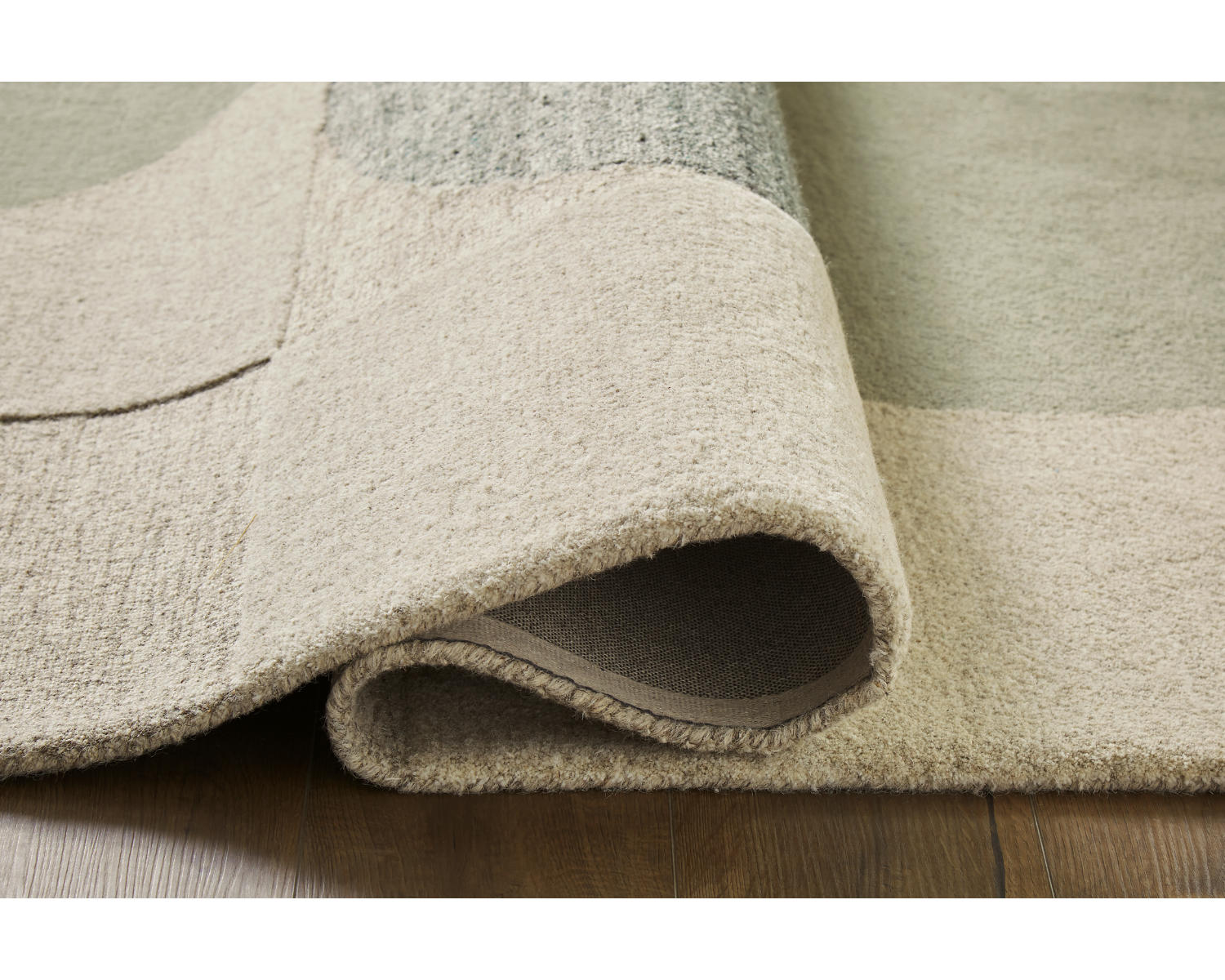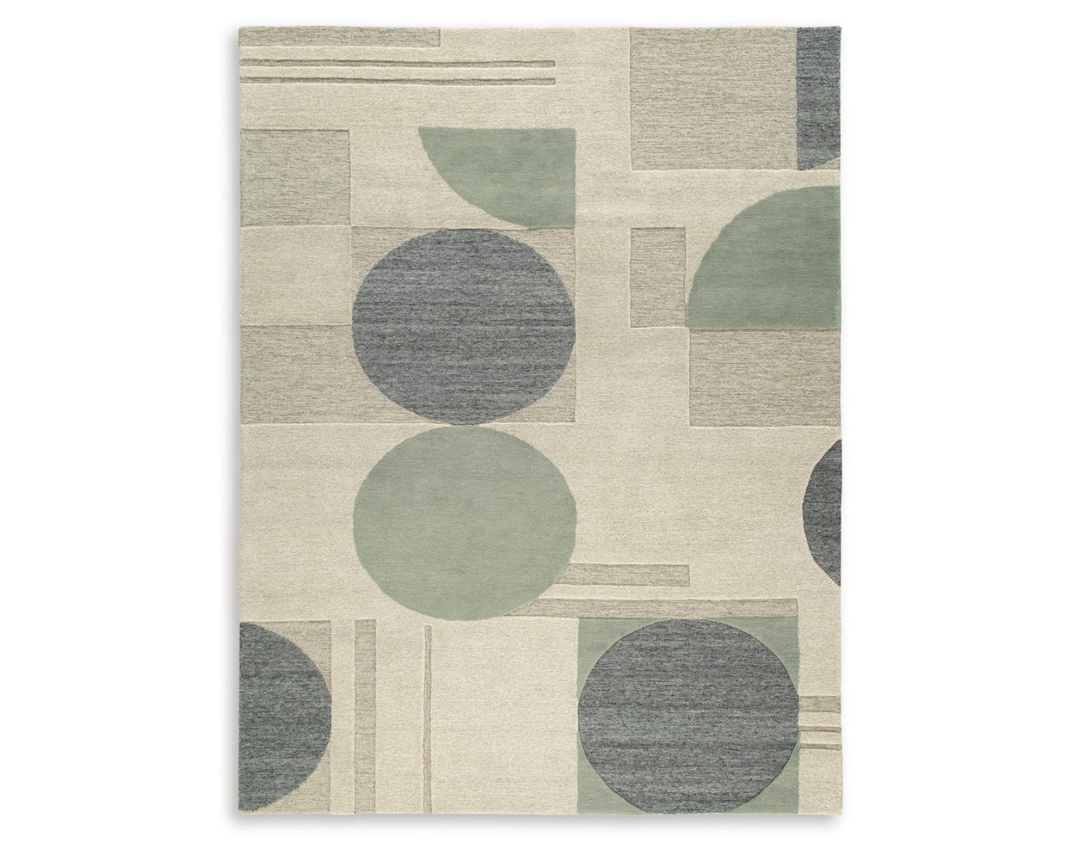 Hand tufted high-low, geometric design in linen, gray, blue and green. 9mm pile. Wool, backed with cotton. Spot clean only. Rug pad recommended. Due to the handcrafted nature of this product, some variation may occur.