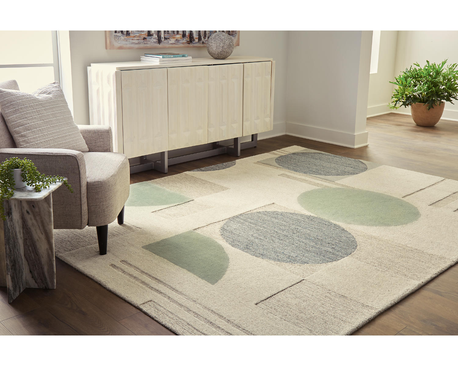 Low-key with high style. This hand-tufted area rug sports casually cool circles, a subtle palette and feel-good design. It's a relaxed sensibility that just works—anywhere and everywhere your floors are in need of a design refresh.