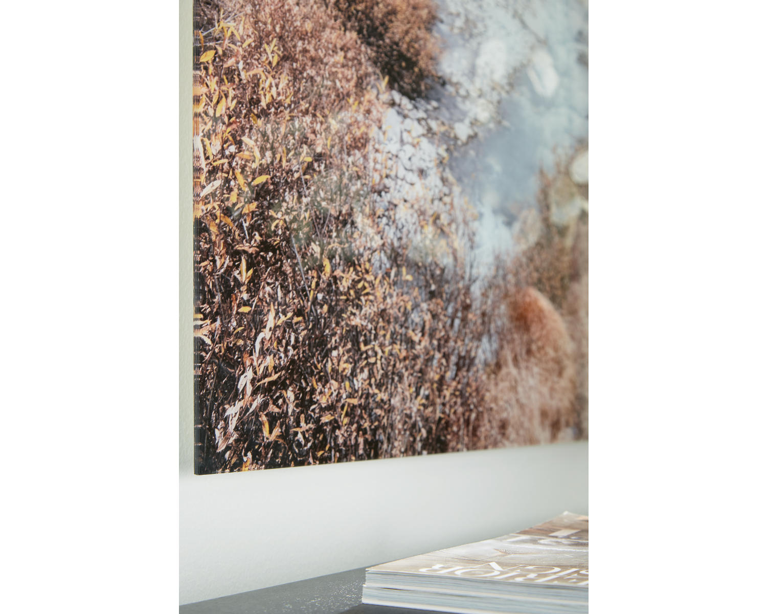 Landscape in shades of gray, brown and white. Print on glass. Sawtooth bracket for hanging. Vertical hanging only.