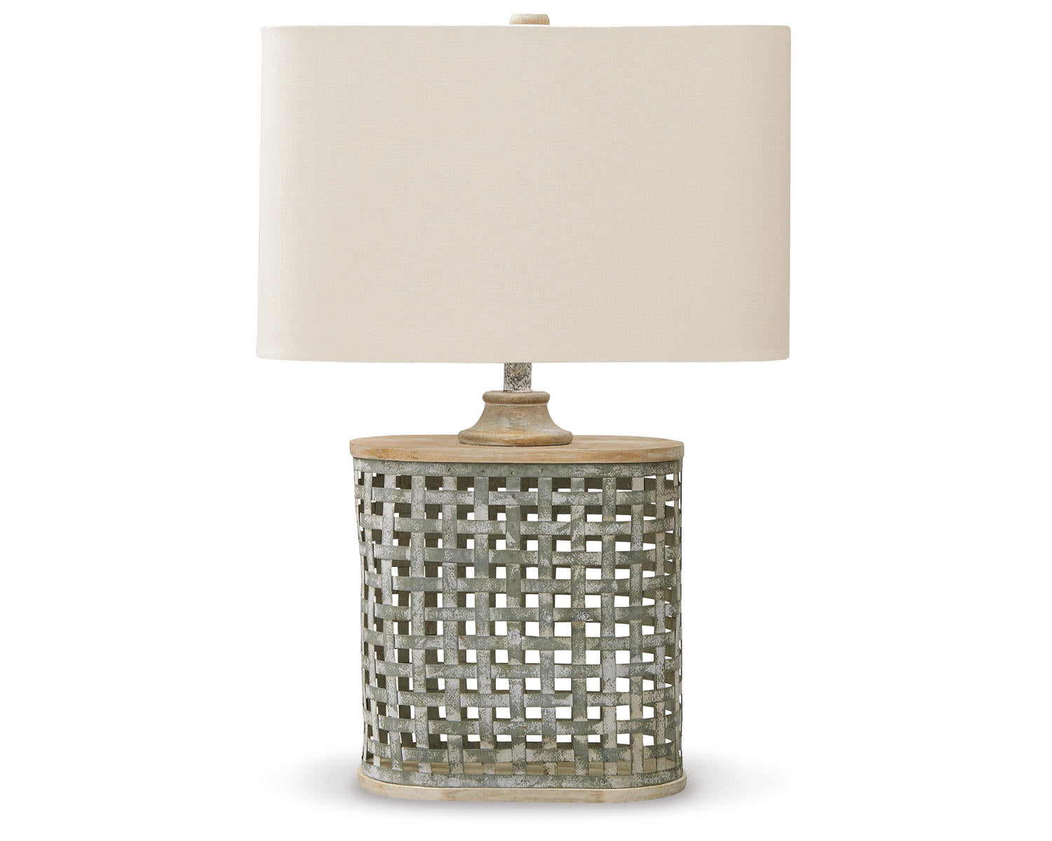 White washed finished galvanized metal and wood table lamp. Rounded corner rectangle hardback shade. 3-way switch. (1) E26 socket, type A bulb recommended - 150 watts max or 25 watts max CFL. Due to the finishing process of this product, some variations may occur.