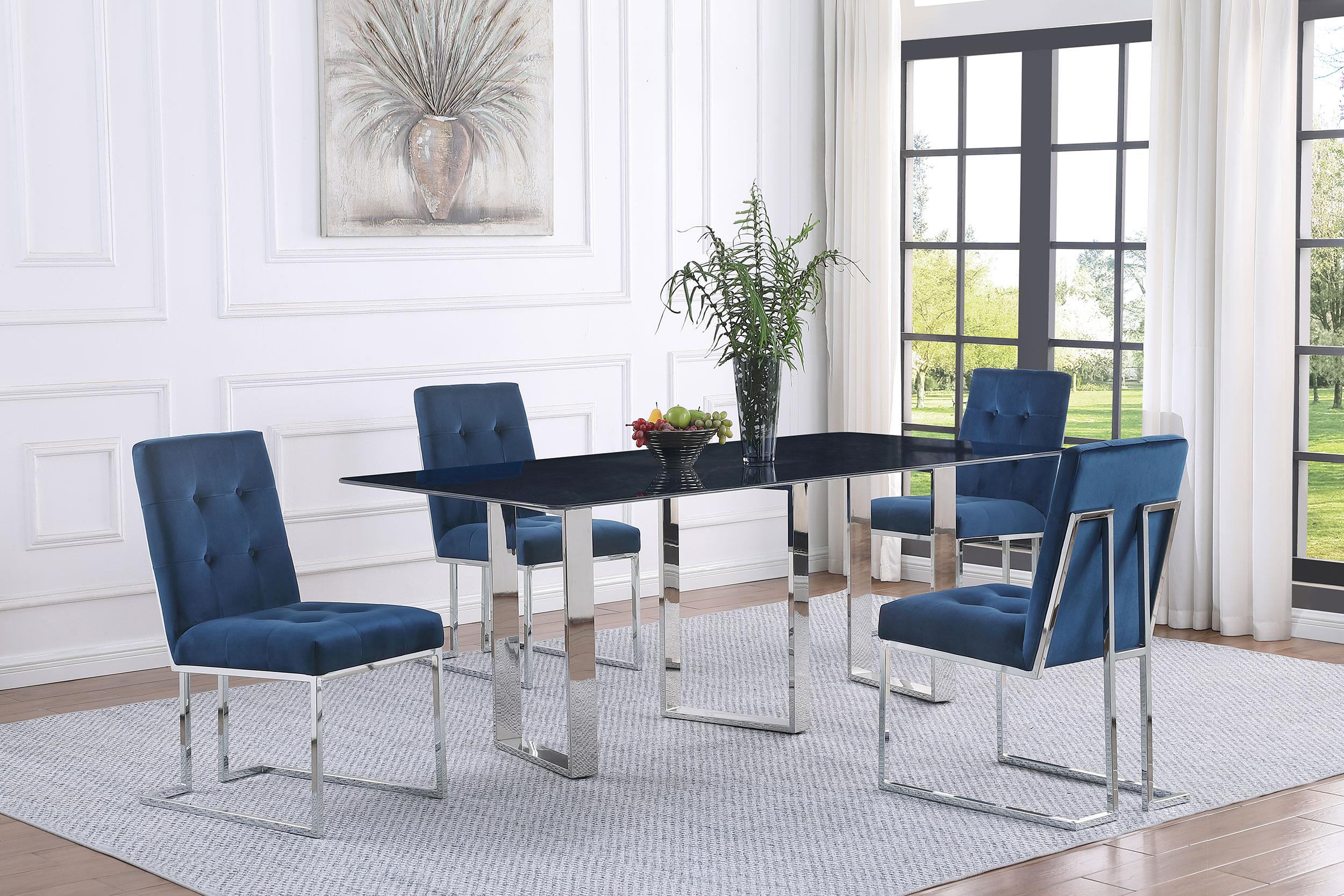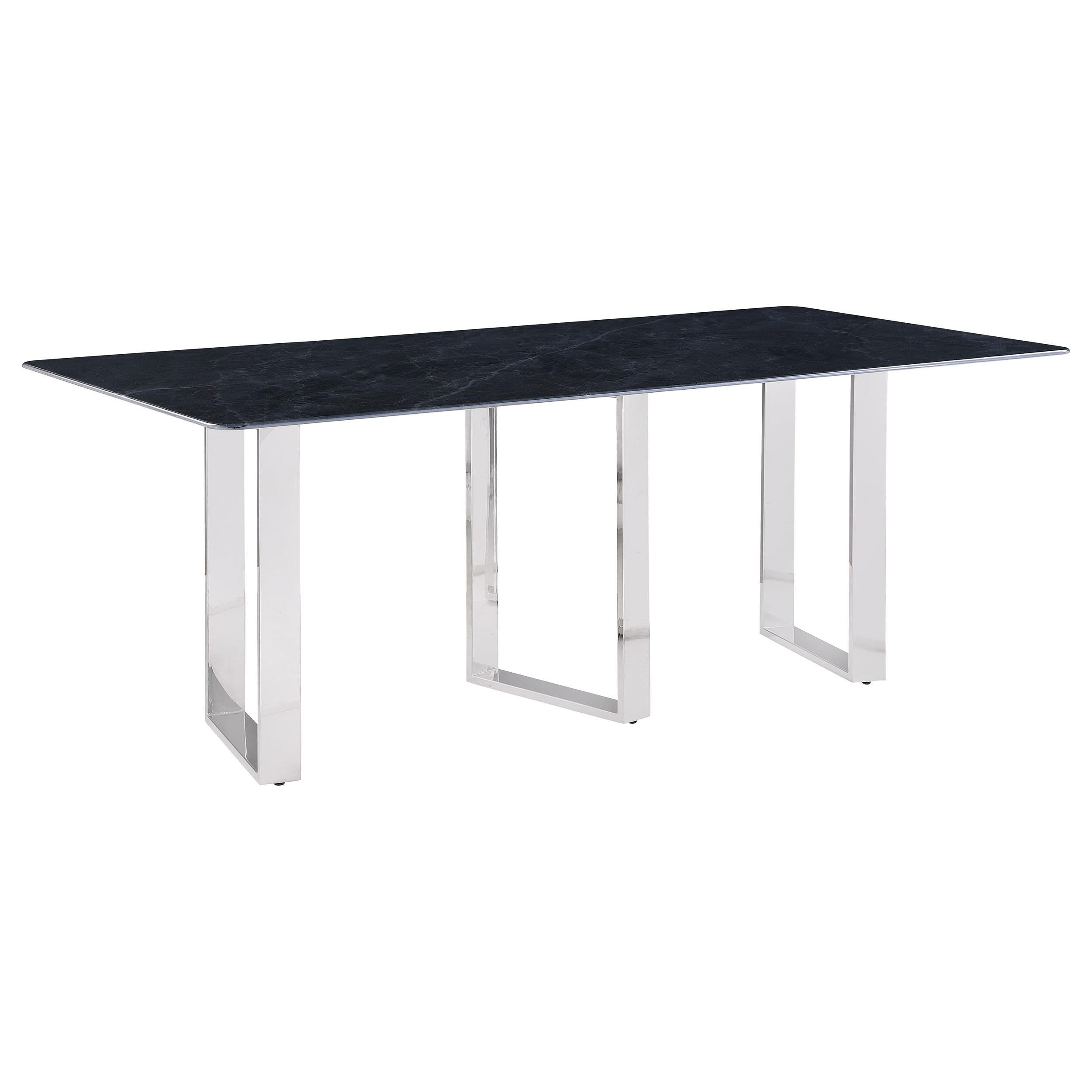 Inject a sense of sophistication with a modern rectangular dining table. Featuring a sintered stone tabletop with a gray marble finish and slim, sleek silhouette, the table becomes a stylish centerpiece in your dining room. It stands on three open frame legs that add airy, sculpted style. The angular presentation of its legs adds intriguing visual dimensionality in any dining room. A polished silver-tones finish is timeless and refined, perfect for your space.