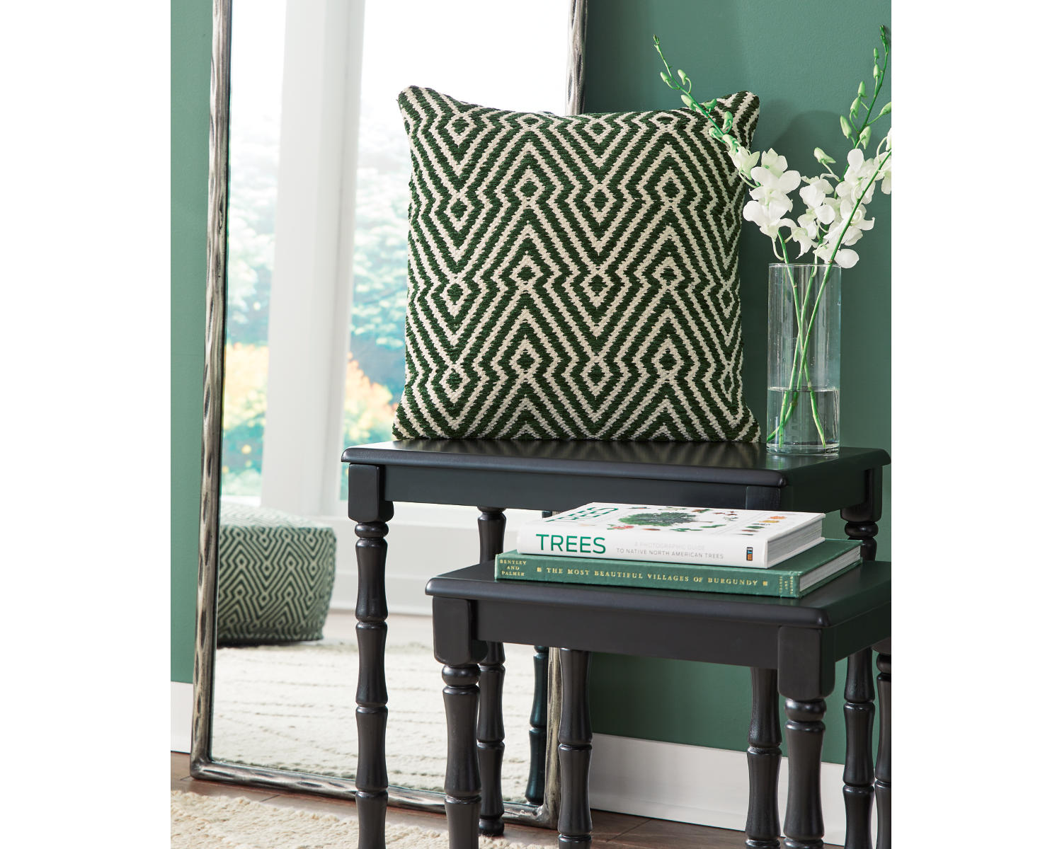 Hand woven geometric design in green and ivory. Solid reverse in white. Knife edge construction. Cotton face with polyester reverse. Zipper closure. Fiber filled. Spot clean only.