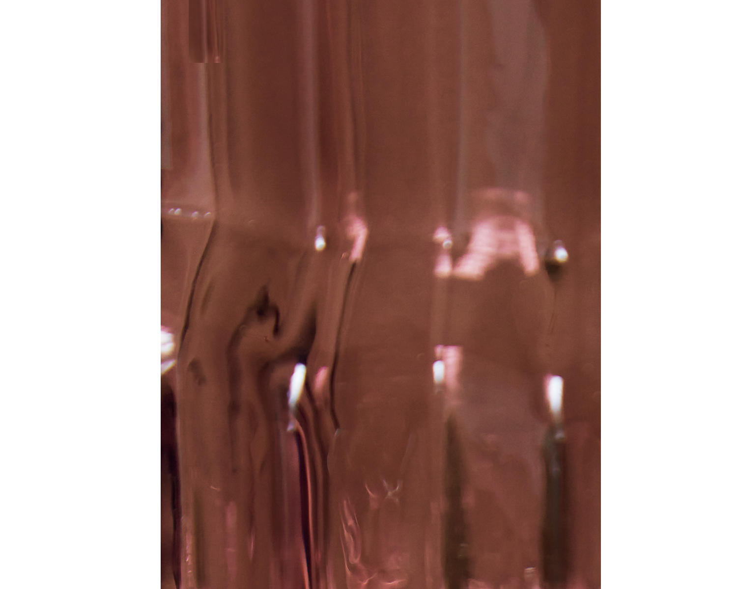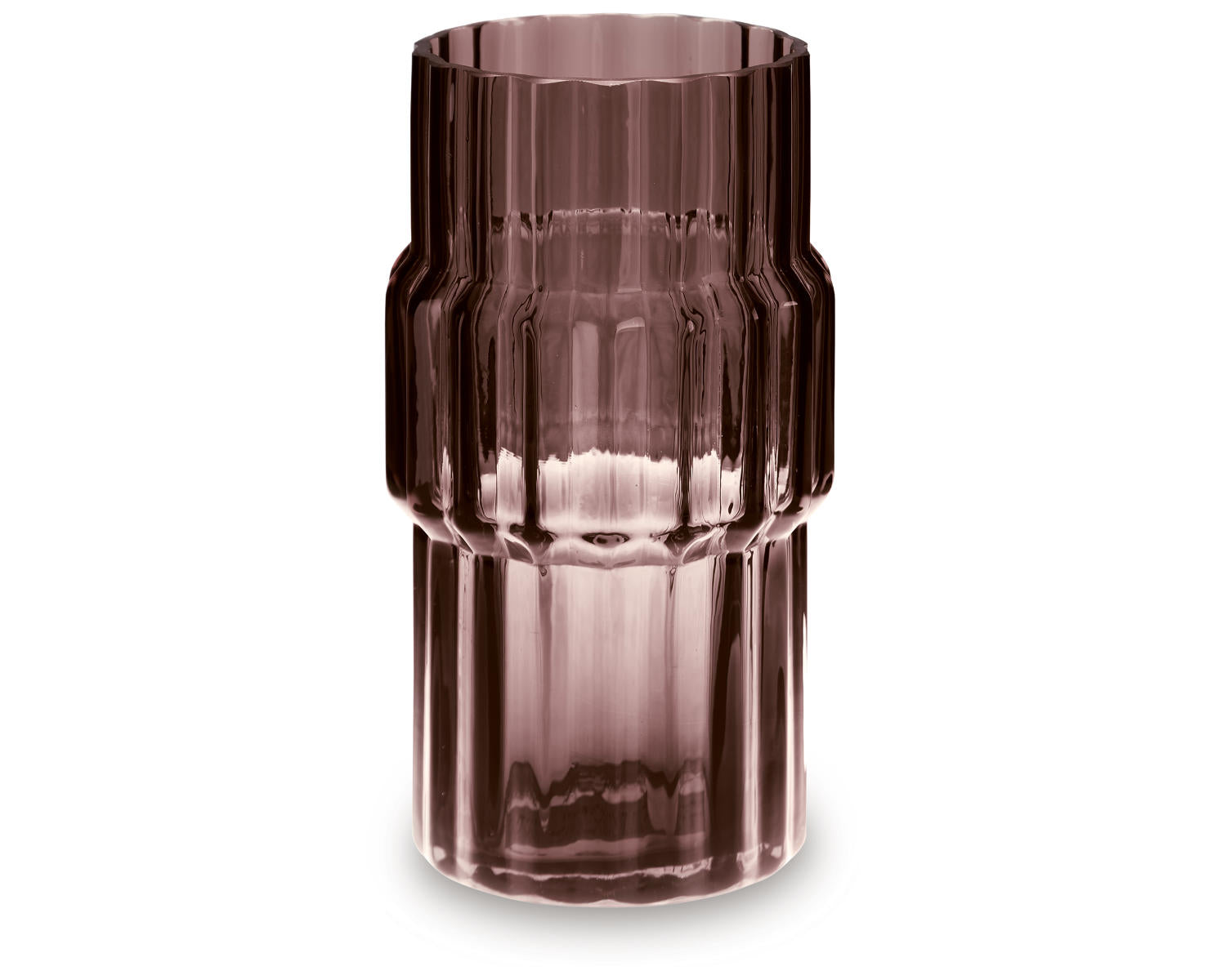 This vase, made of dark mauve-tinted glass, adds a captivating touch to indoor or outdoor decor. Its unique textured shape and oversized fluted details create an elegant art piece. Whether it's accentuating flowers or candlelight, this vase is simply striking from every angle.