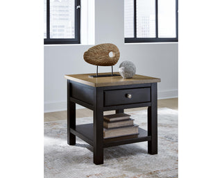 Casual Lifestyle design. Made with acacia solids and acacia veneer with MDF substrate. A trend-right two-tone finish features a light wood tone top contrasted with a dark chocolate brown body. T734-20 cocktail table is loaded with storage options with four drawers and a convenient lift-top for added work or dining space when needed. Casters on the cocktail table for easy mobility. T734-17 chairside end table includes a 110V power supply and dual USB charging ports (USB-A and USB-C). T734-3 end table offers extra drawer storage for a well coordinated room.