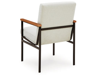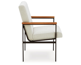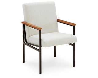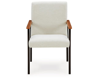 Discover something extraordinary with this upholstered dining arm chair. Its wood armrests are paired with a black metal frame for a clean-lined contemporary appeal. Strikingly simple, this piece creates an understated, modern feast for the eyes whether it’s used for dining or when friends drop by to hang.