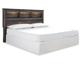 When merged in just the right way, rustic and industrial styles can make one happy marriage. Case in point: this king/California king bookcase headboard. A refined take on barn board beauty, its complex, replicated wood grain showcases hints of burnt orange and teal tones for a sense of weatherworn authenticity. Three open cubbies lined with a dimming LED light strip keep bedtime reads top of mind.